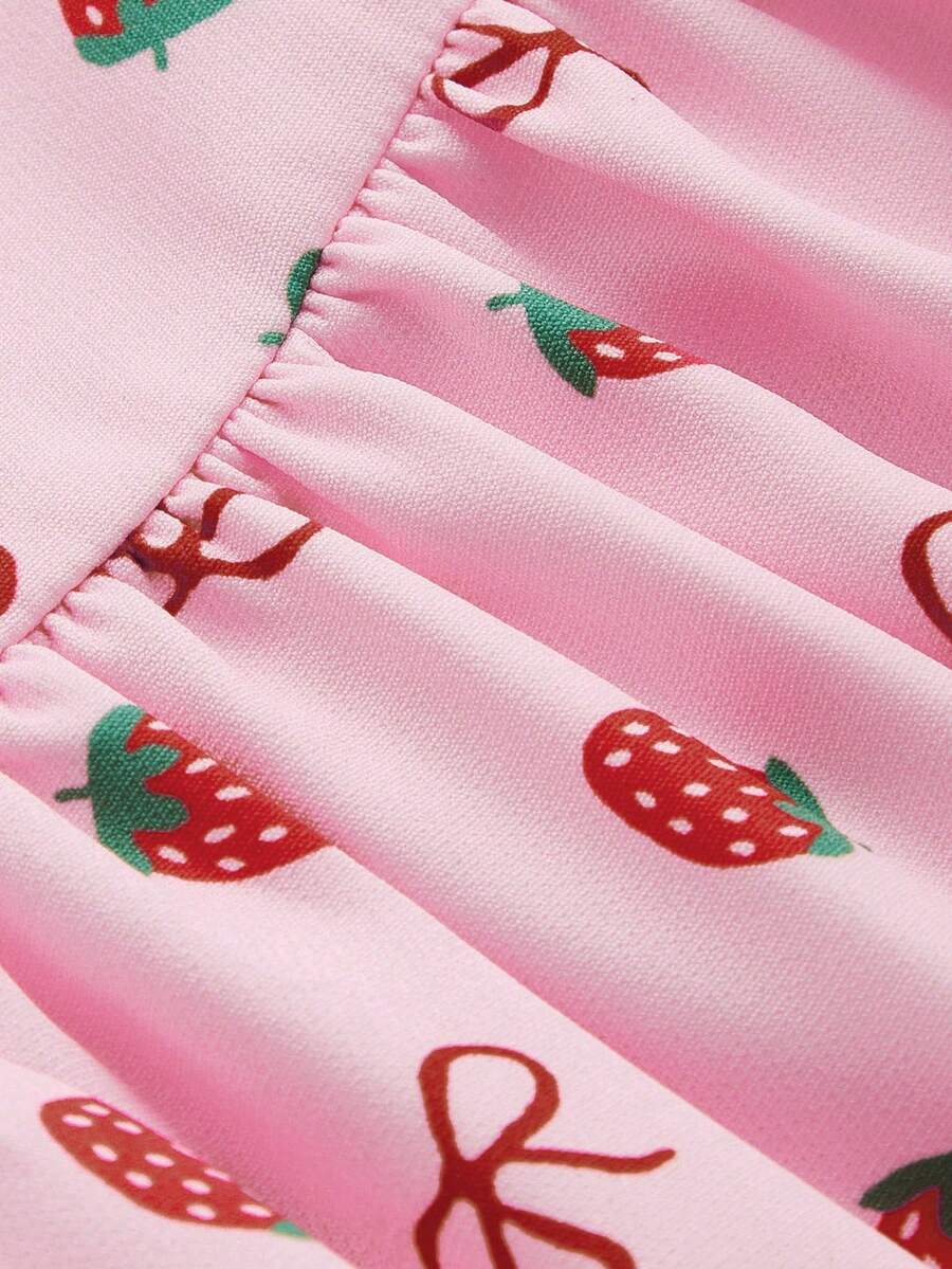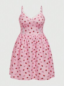 Kawaii Plus Size Strawberry Print Lace Trimmed Cami Dress With Bowknot