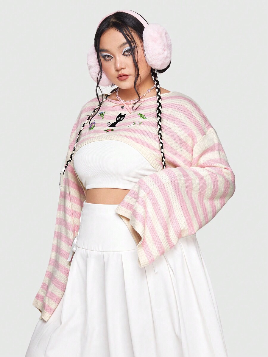 Kawaii Plus Striped Pattern Cat Embroidery Drop Shoulder Crop Sweater