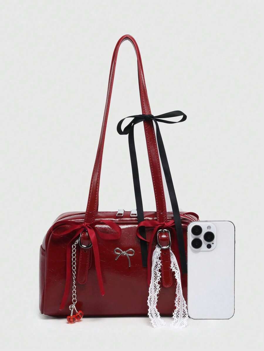 Kawaii Retro Cute Polka Dot Bowknot Decor Cherry Heart Shoulder Underarm Bag With Multiple Pockets For Women