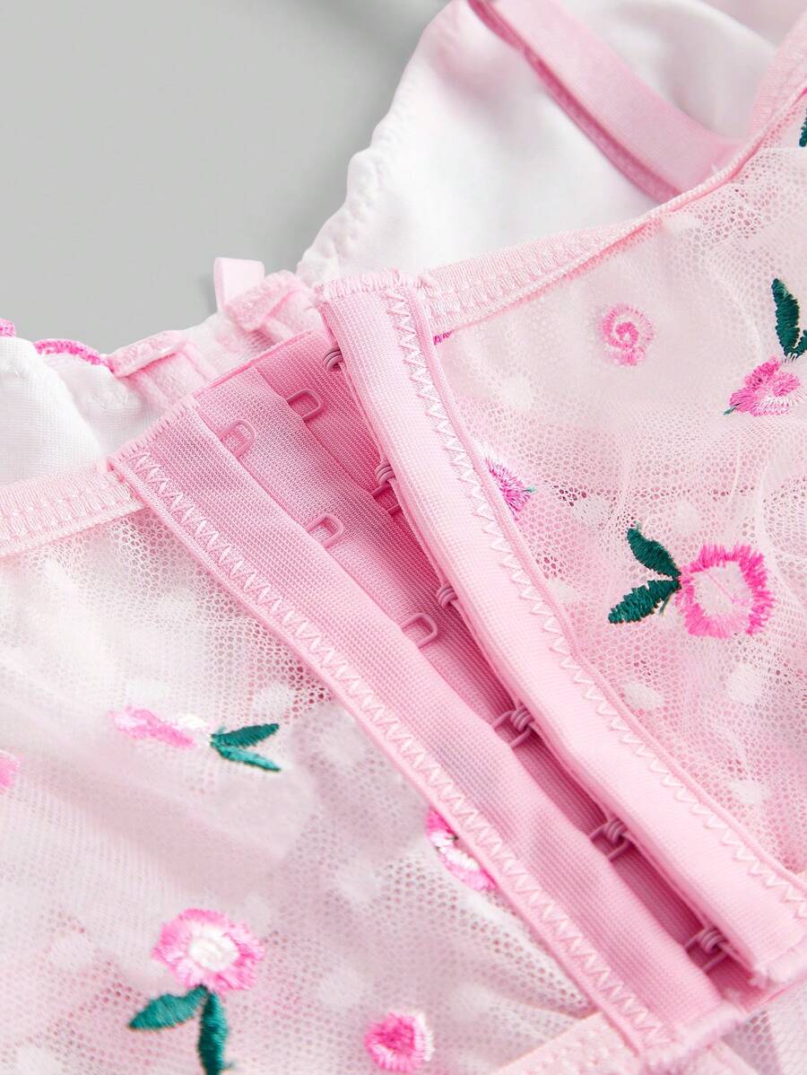 Kawaii Romantic Vacation Style Spring Floral Embroidery Mesh & Polka Dot Patchwork Handmade Lingerie As Outerwear With Underwire Bra