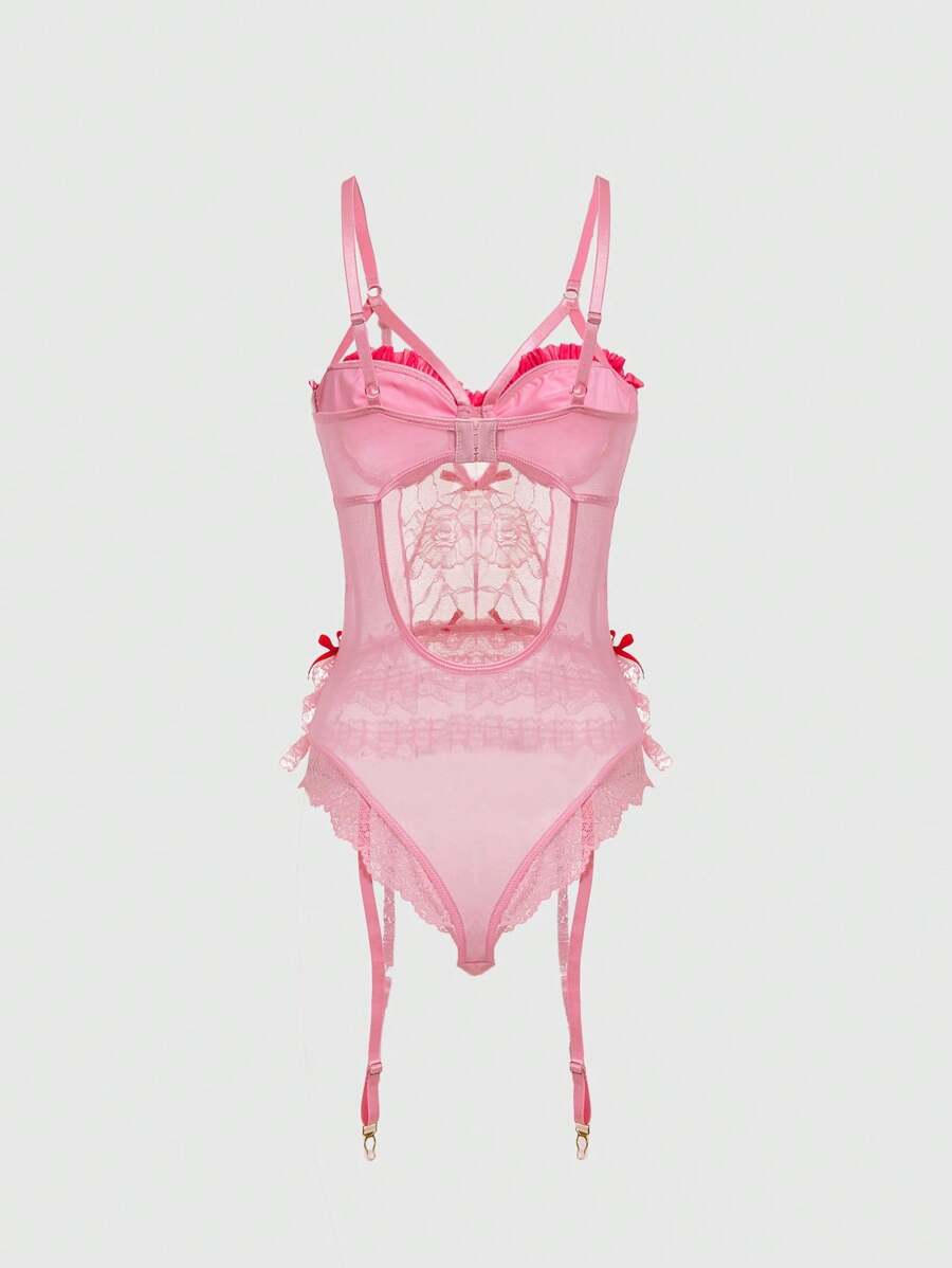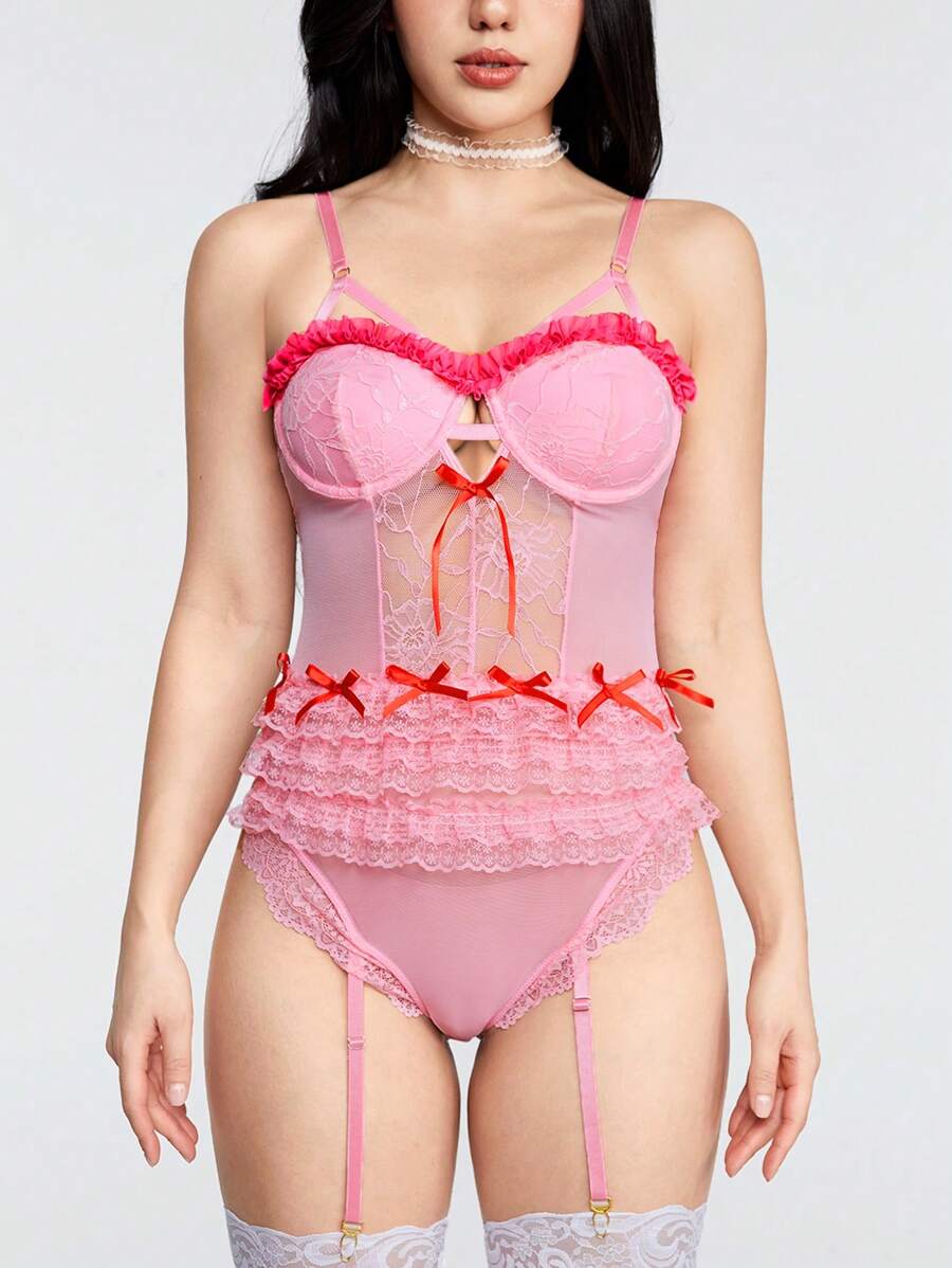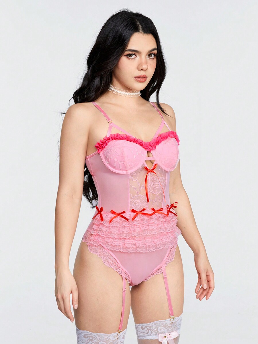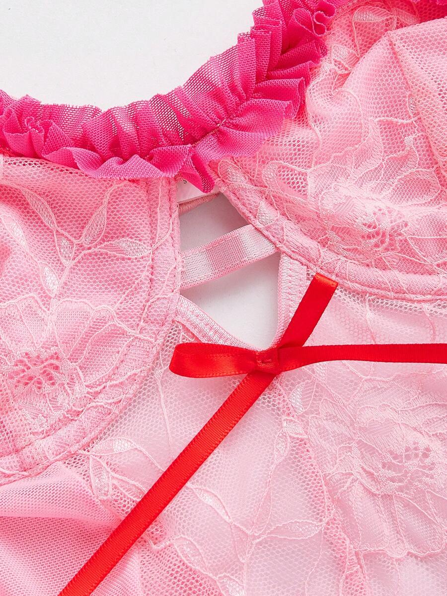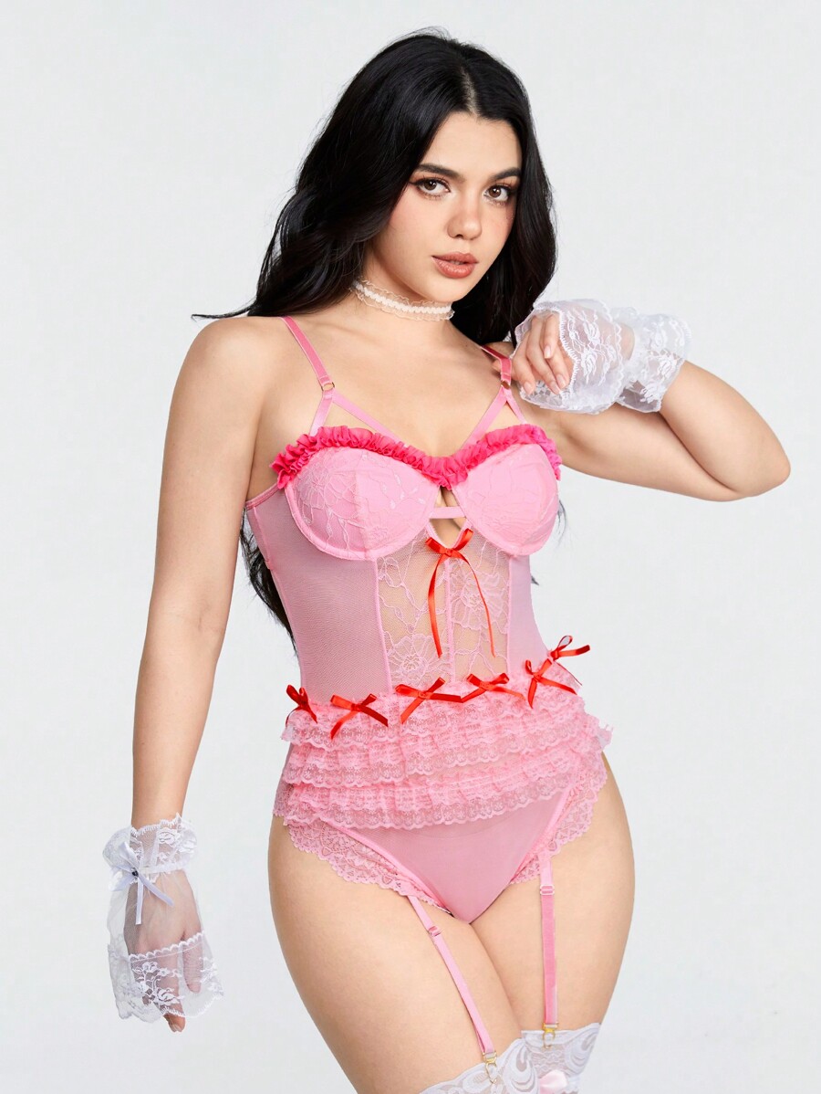 Kawaii Sexy Lace Mesh Splicing Bow Knot Tie Cake Layer Bodysuit With Underwire And Elastic Strap