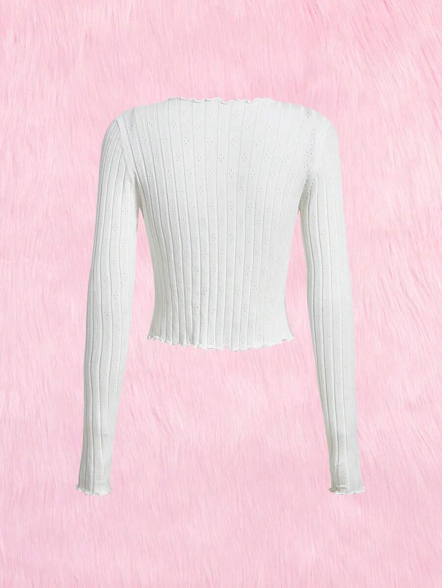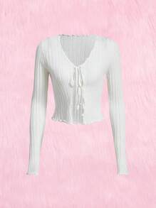 Kawaii Solid Lettuce Trim Tie Front Lace Up Cardigan