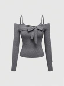 Kawaii Spring Sweet Elegant Off Shoulder Ruffle Collar Bow Long Sleeve Elastic Waist Gray Women Sweater