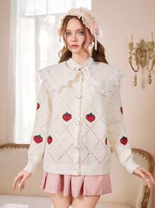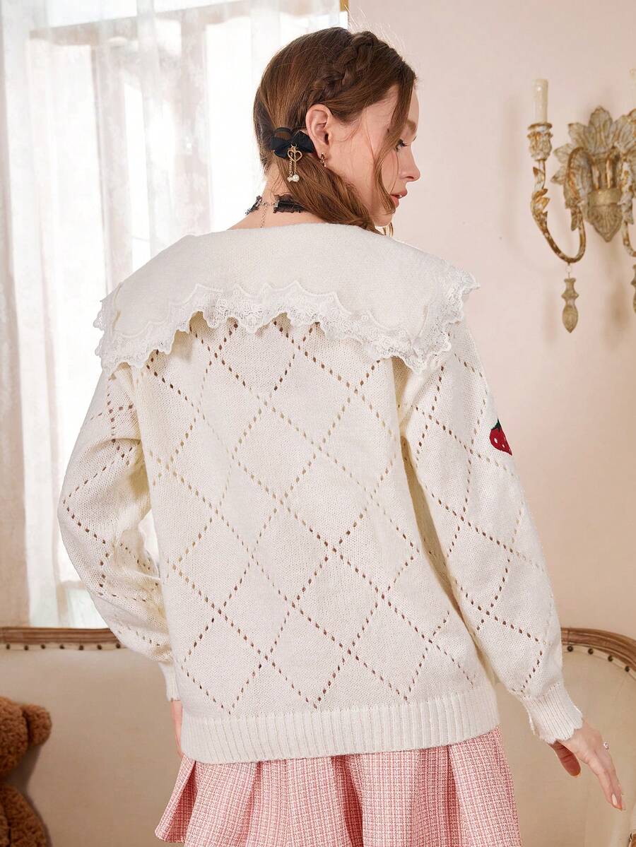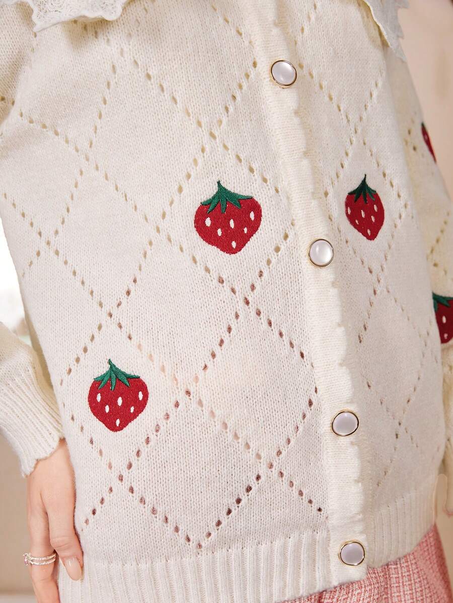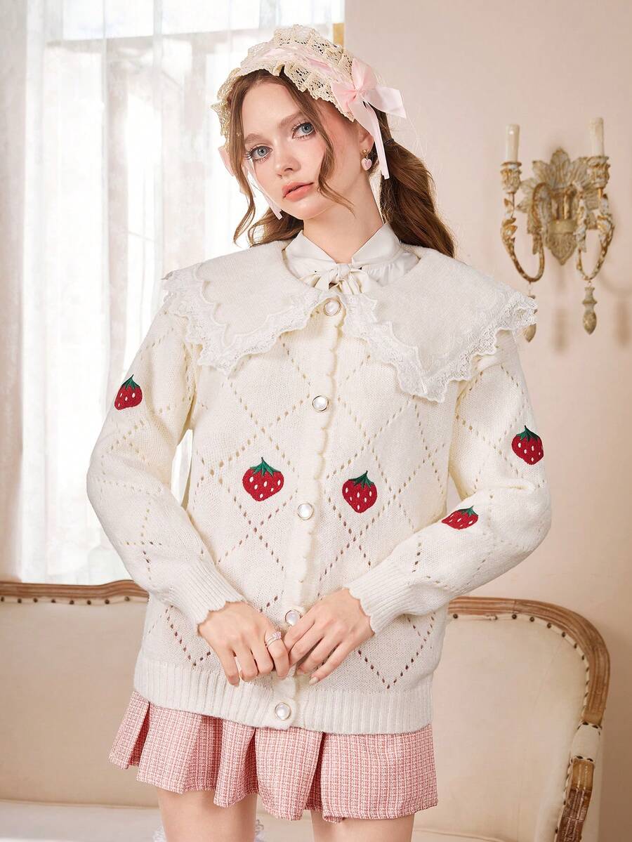 Kawaii Strawberry Embroidery Statement Collar Pointelle Knit Cardigan