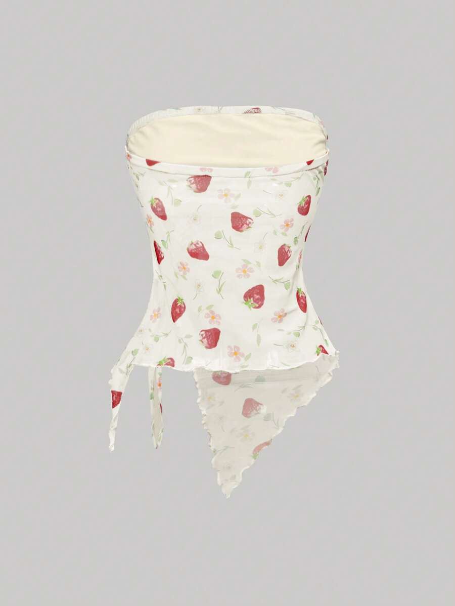 Kawaii Strawberry Print Asymmetric Hem Summer Tube Top, Y2K Style, Mesh Fabric