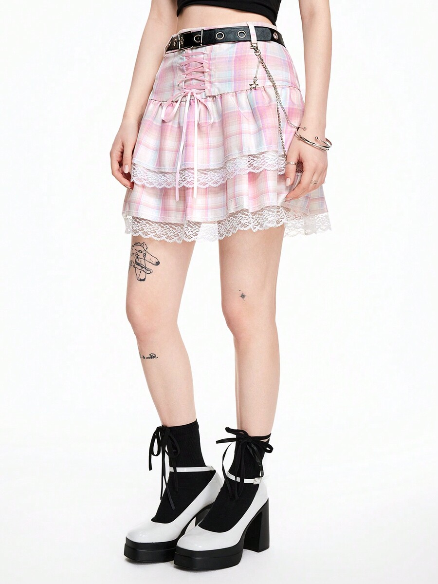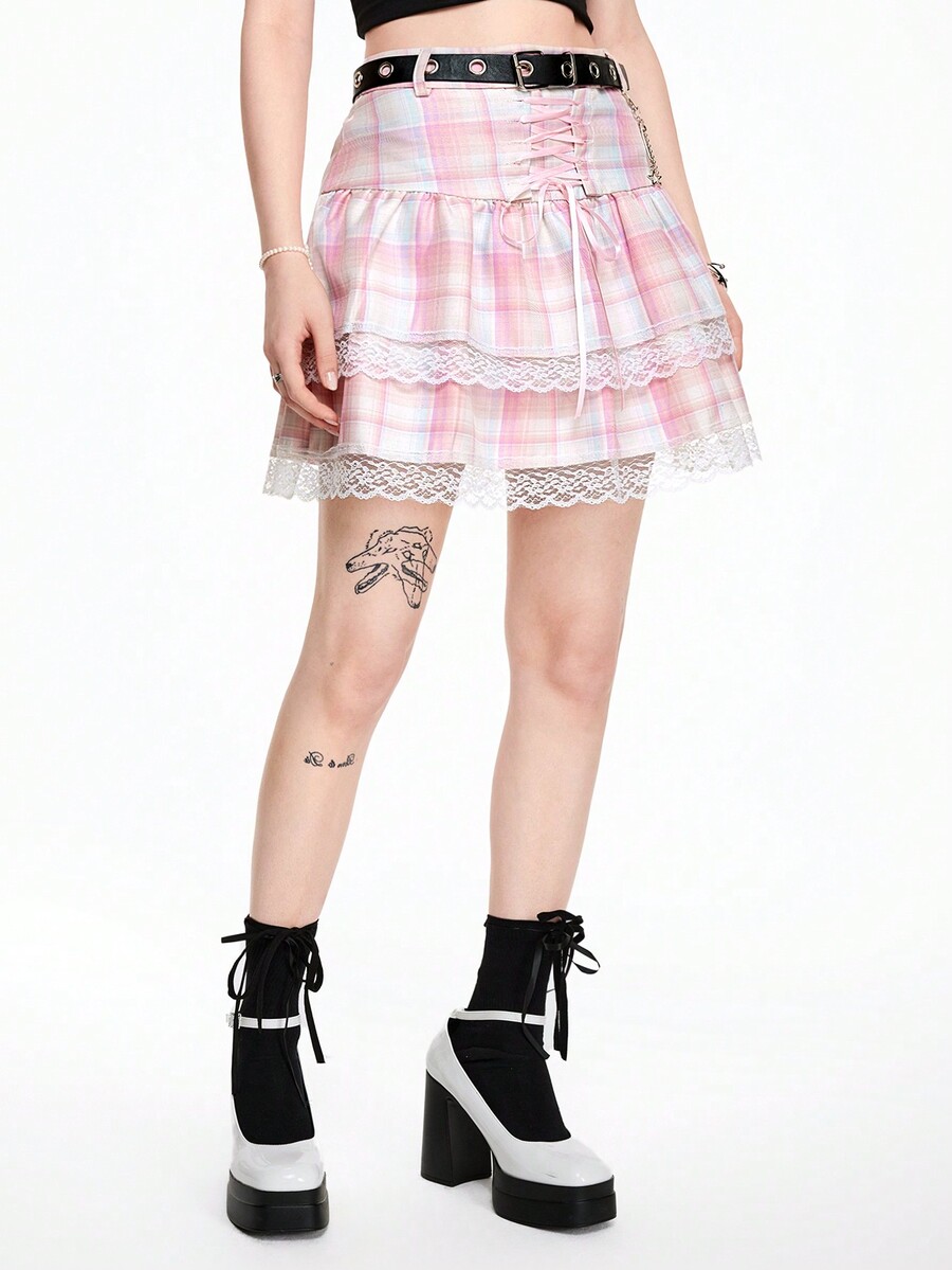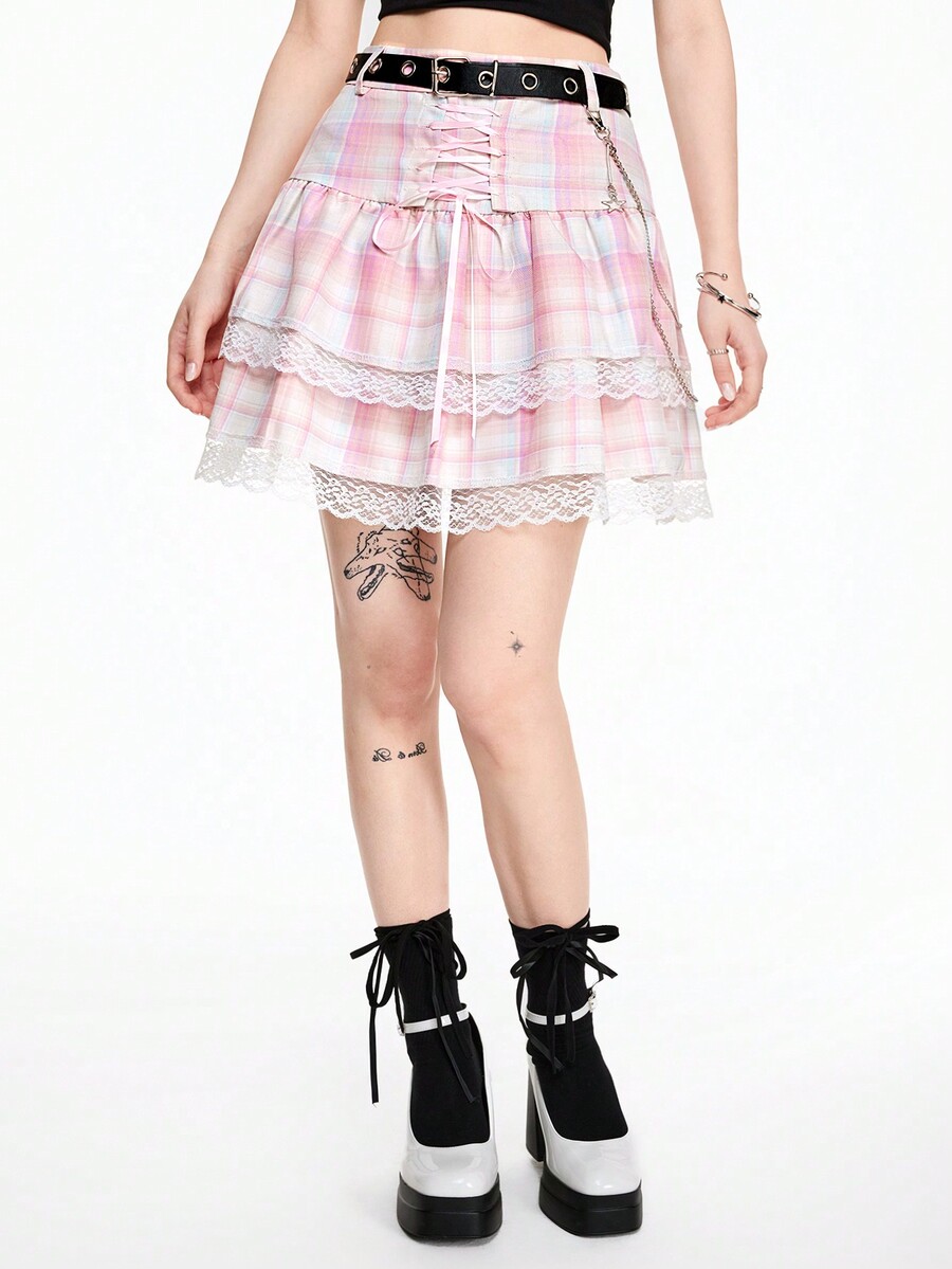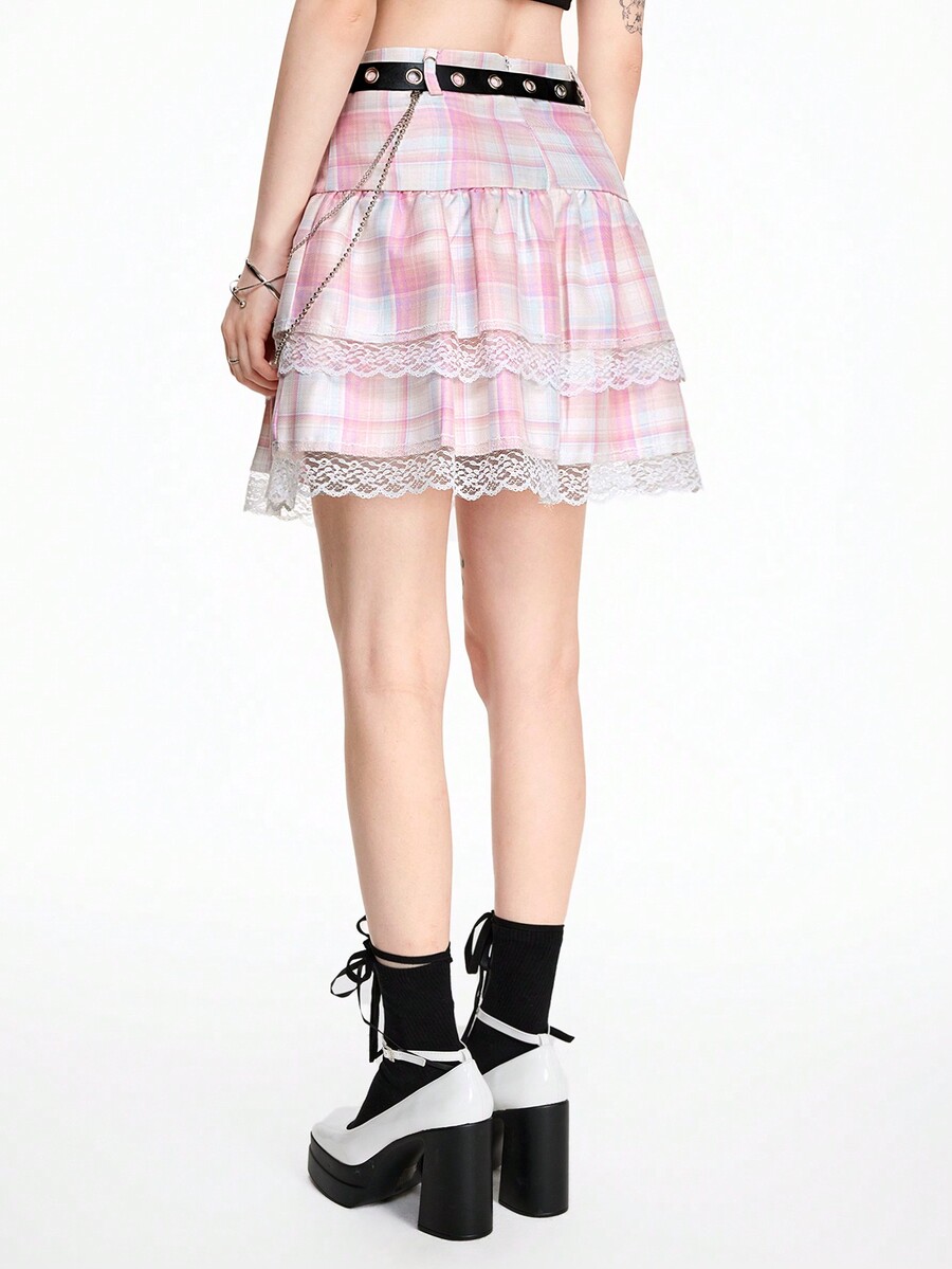 Kawaii Streetwear Punk Rock Style Leather Belt, Chain, Eyelet, Star Plaid Lace Bow Layered Lace Trim Mini Skirt For Women