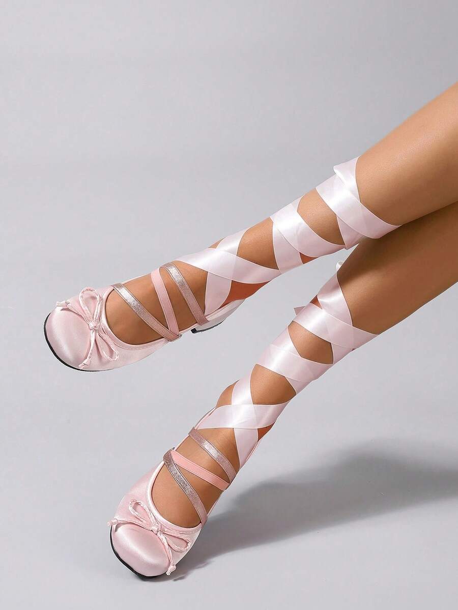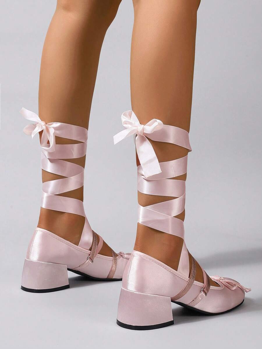 Kawaii Vintage Style Bowknot Lace & Tied Design Pink Two-Way Ballet Heels, Medium High Heel