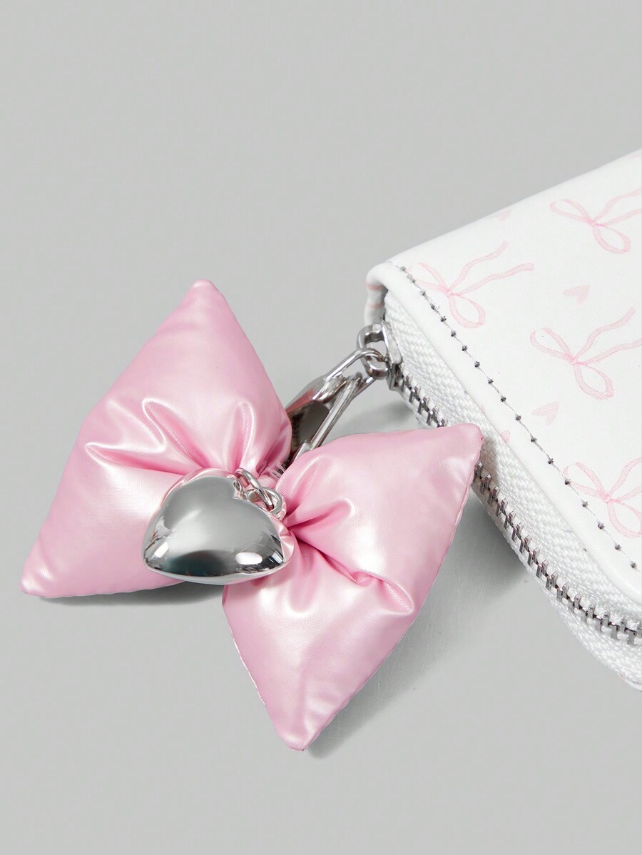 Kawaii White Background Pink Bowknot Short Wallet With Bowknot Heart Pendant, Creative Multi-Functional Card Slot Wallet
