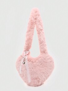 Kawaii Women Fluffy Heart Faux Pearl Bowknot Decor Drawstring Shoulder Bag With Large Capacity