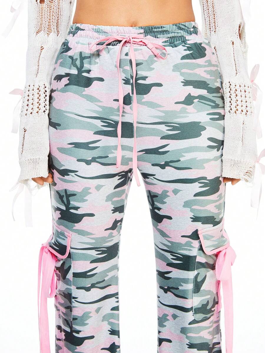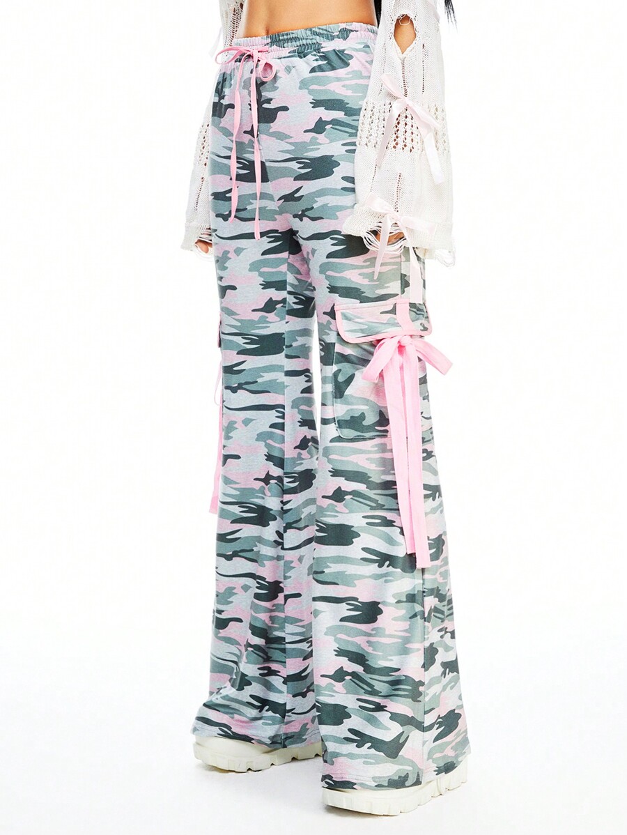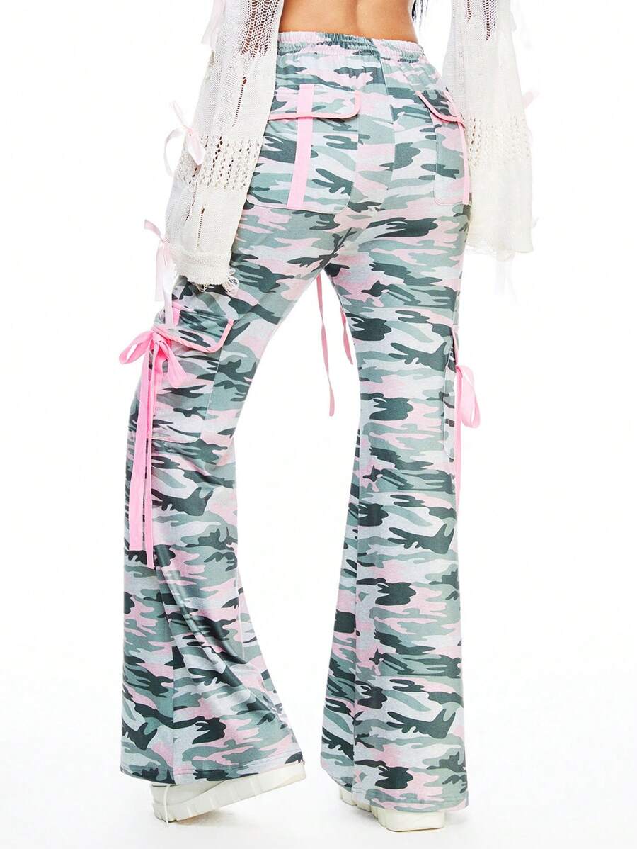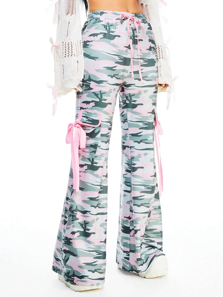 Kawaii Women Harajuku Camo Print Lace Ribbon Tie Flare Cargo Pants
