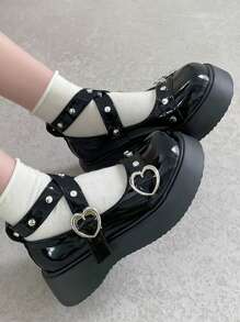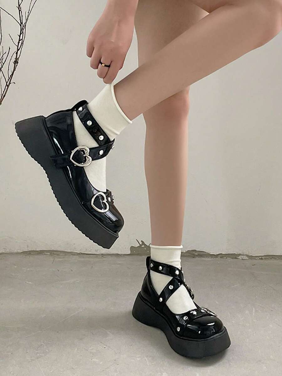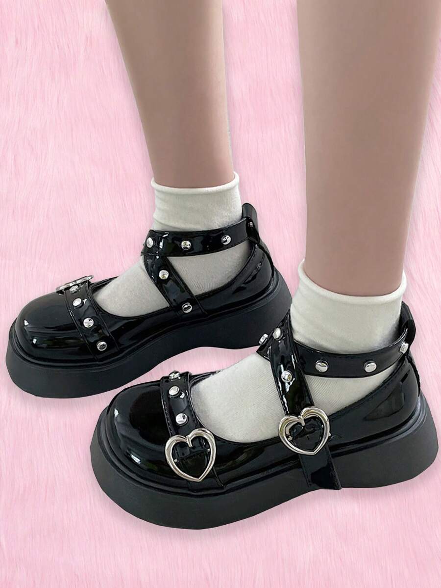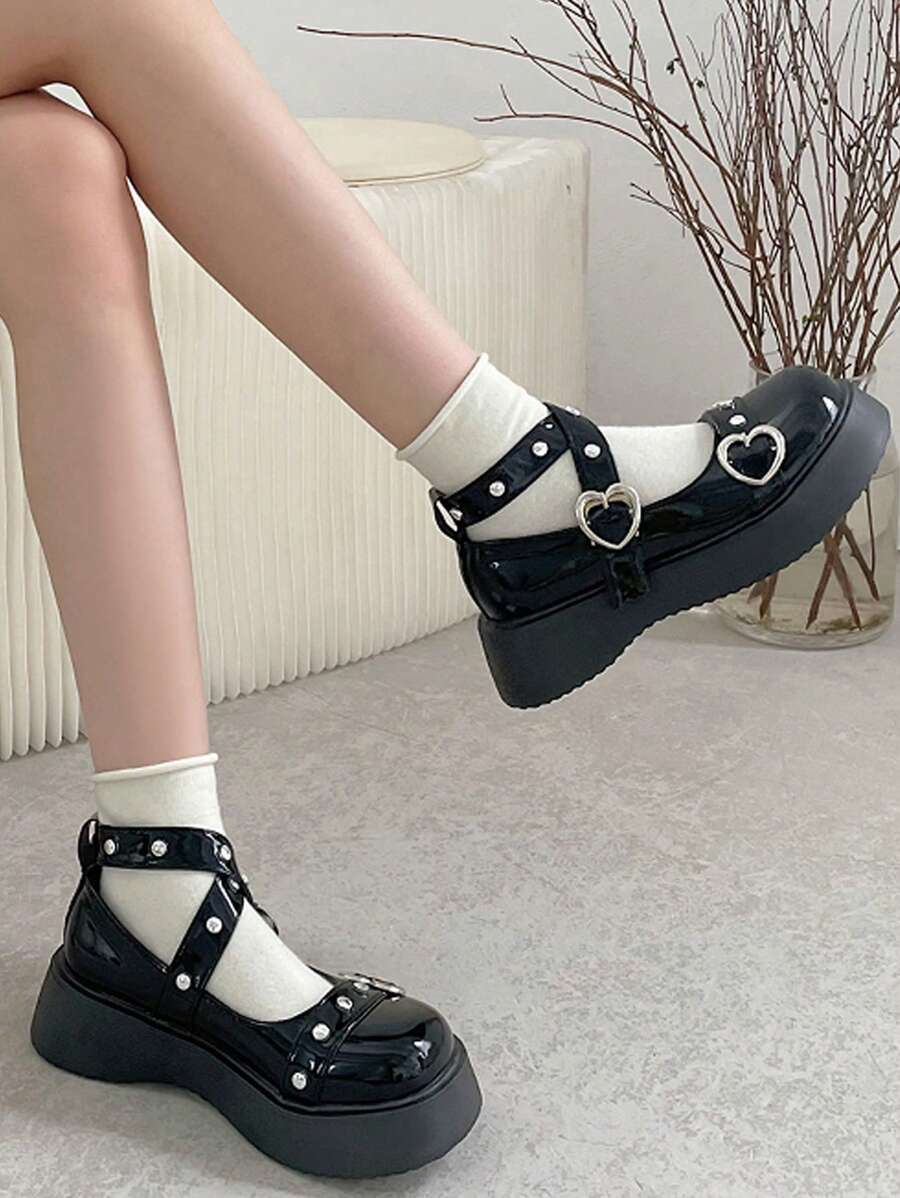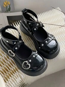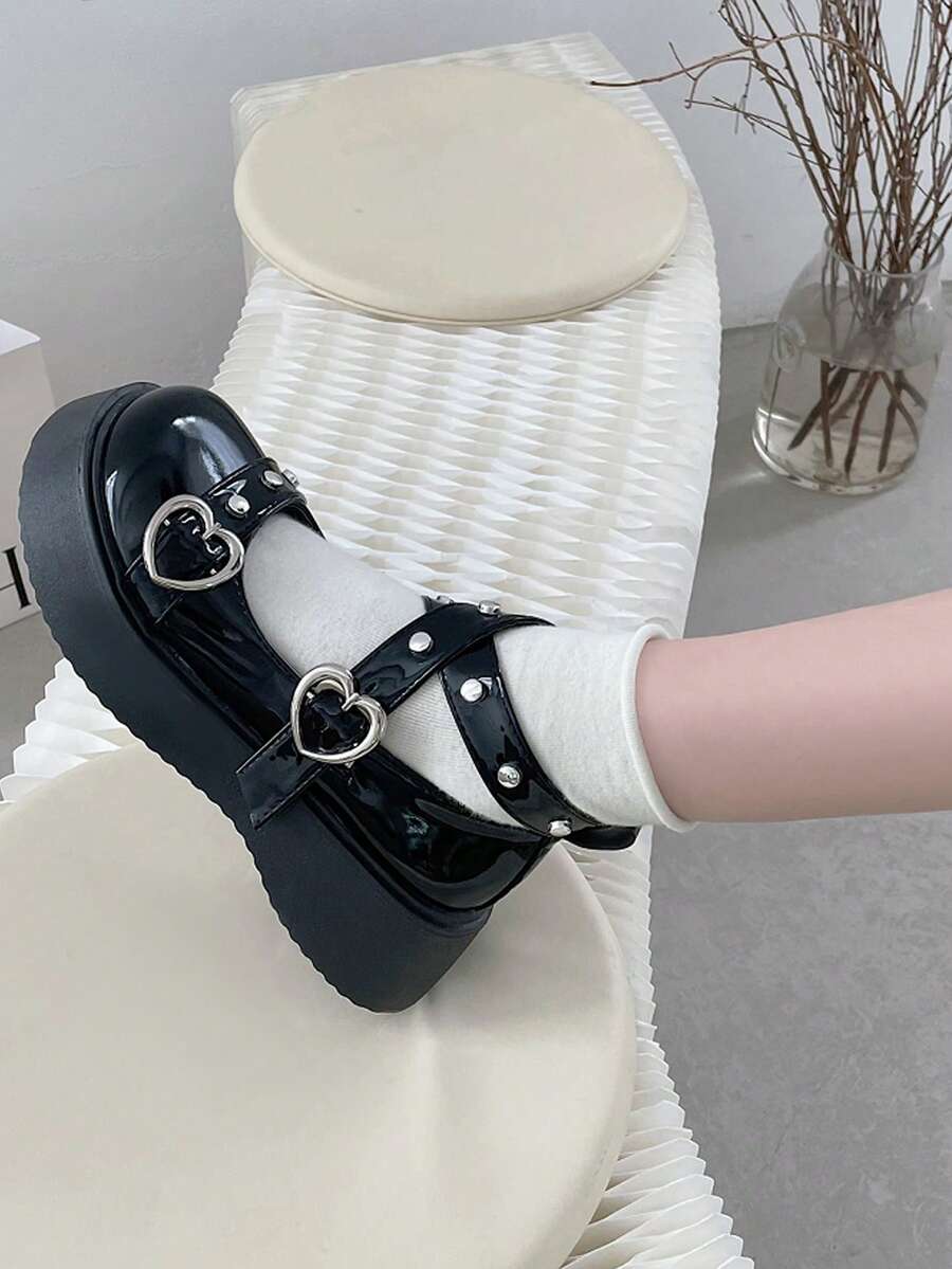 Kawaii Women Heart Buckle Decor Round Toe Flatform Mary Jane Shoes, Preppy Outdoor Mary Janes