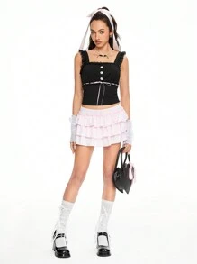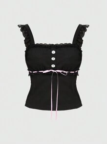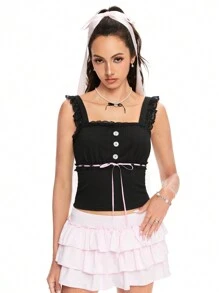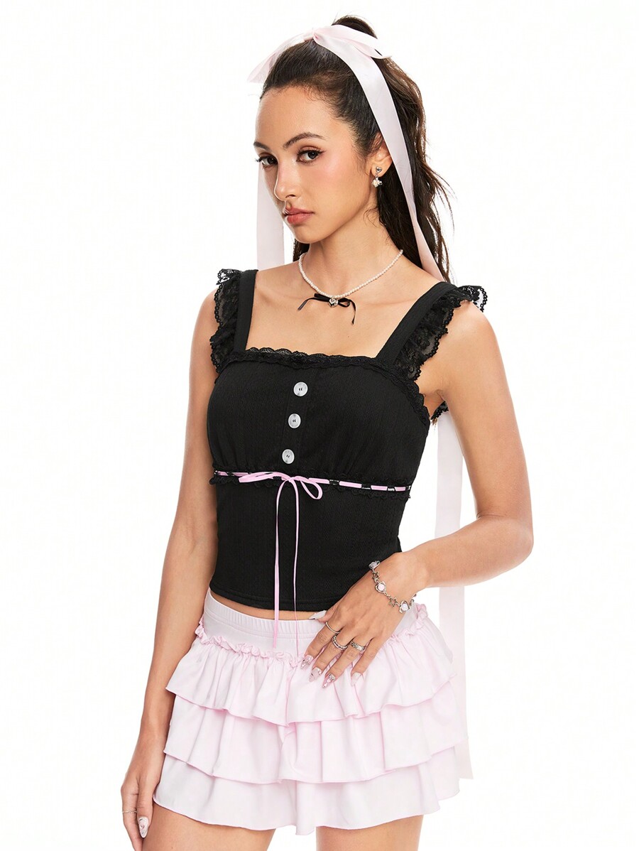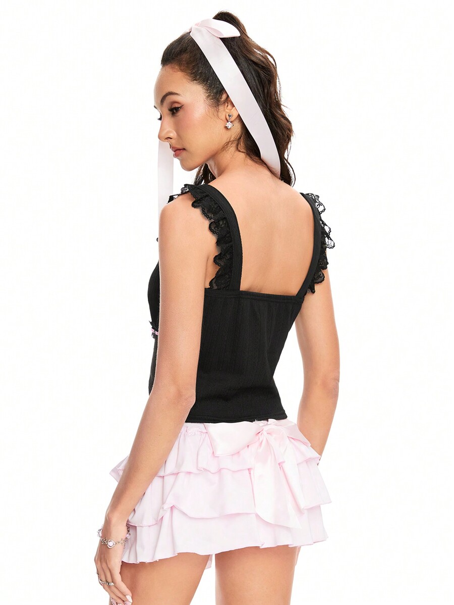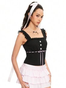 Kawaii Women Lace Trim Sleeveless Black Tank Top With Pink Ribbon Decor, School