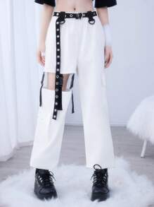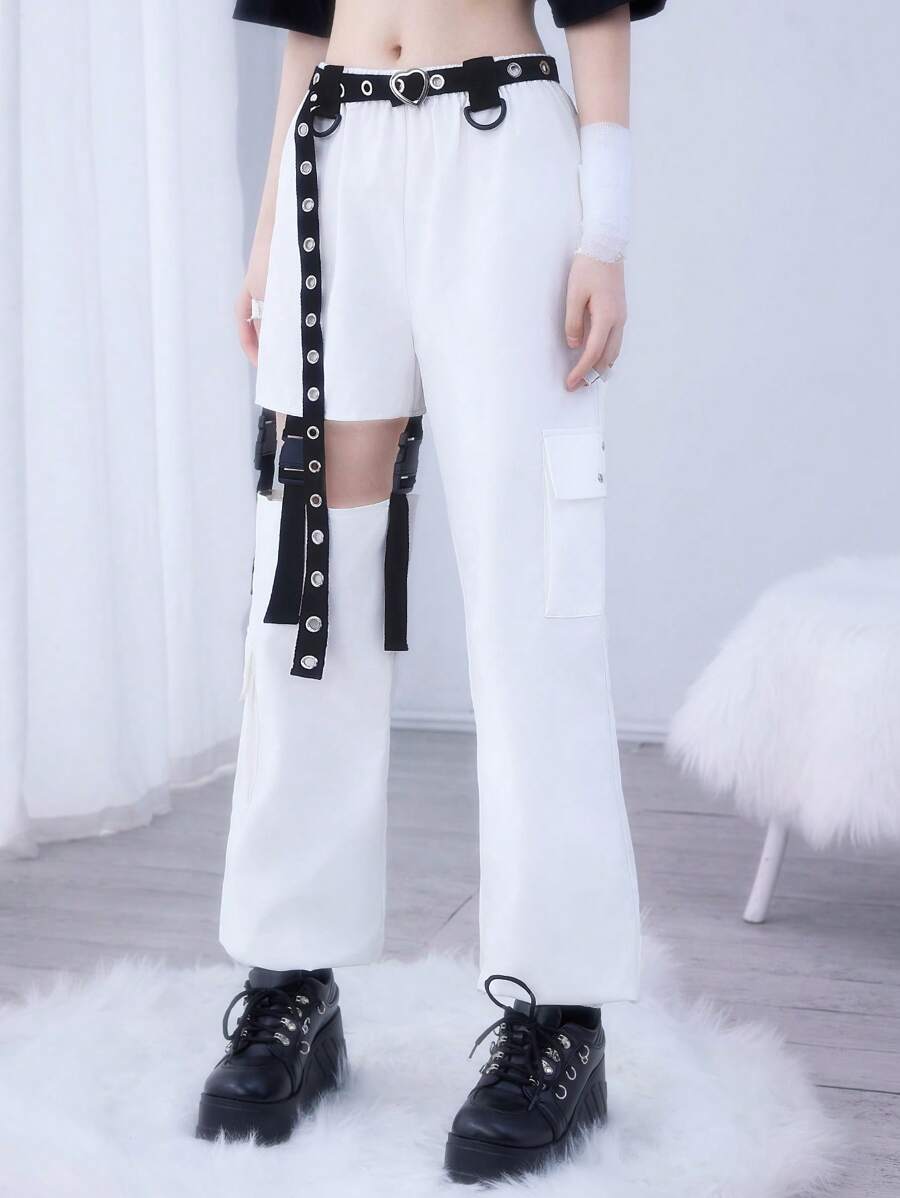 Kawaii Women Pocket Minimalist Hollow Out Straight Leg Pants, Casual Daily Wear