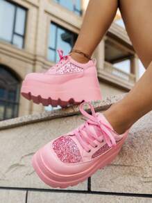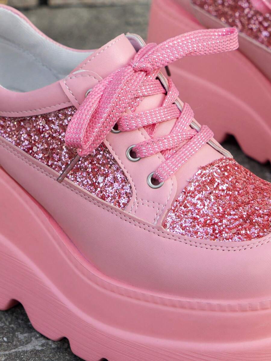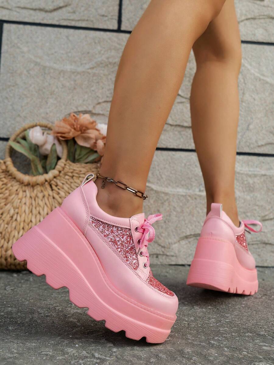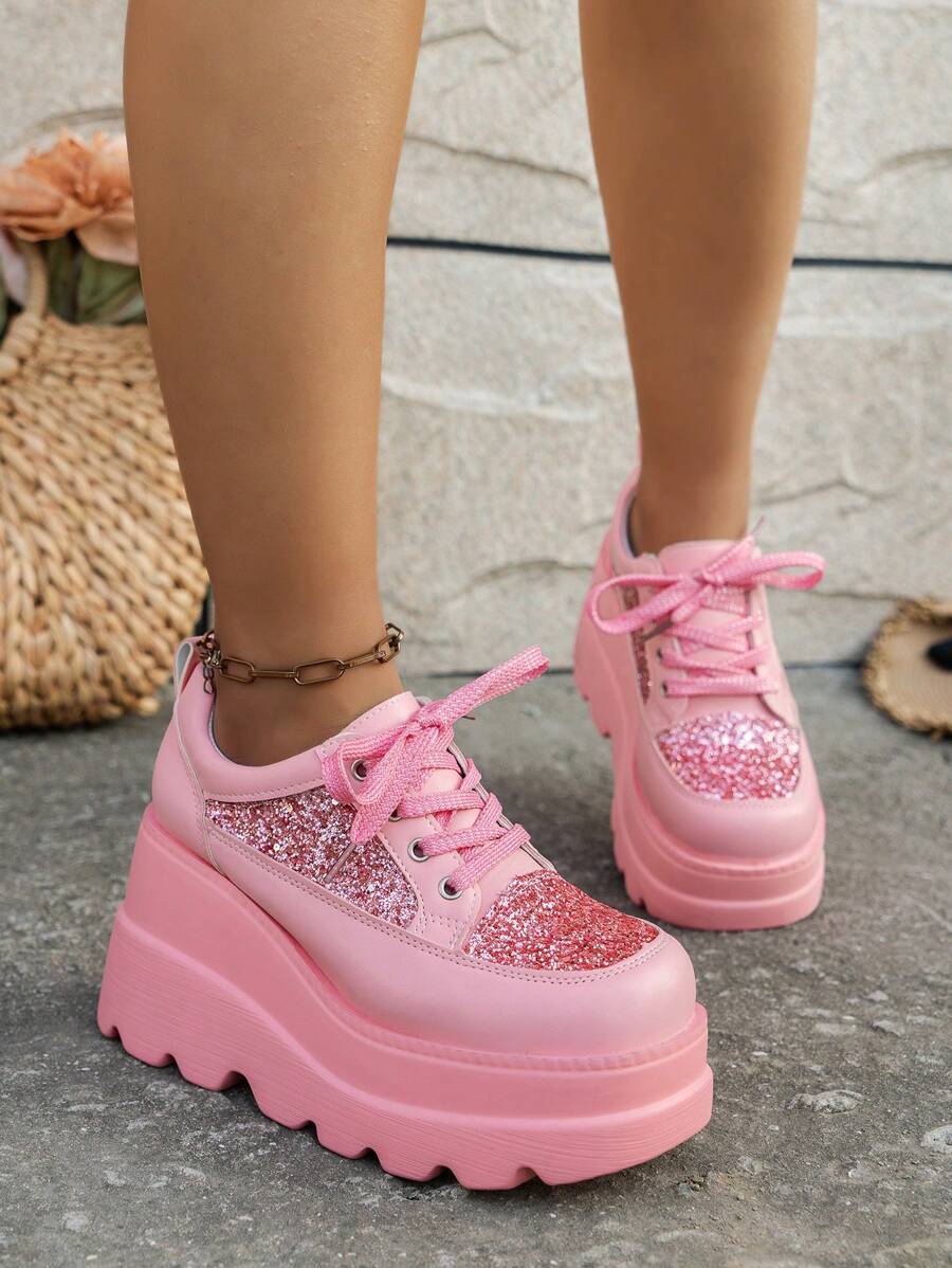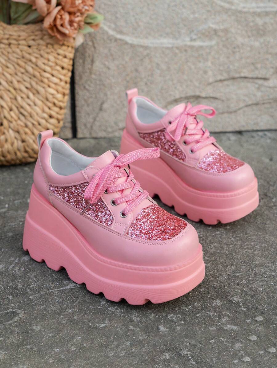 Kawaii Women'S 2024 New Spring And Autumn Classic Round Toe Glitter And Rhinestone Pink Wedge Heel Thick-Soled Sneakers