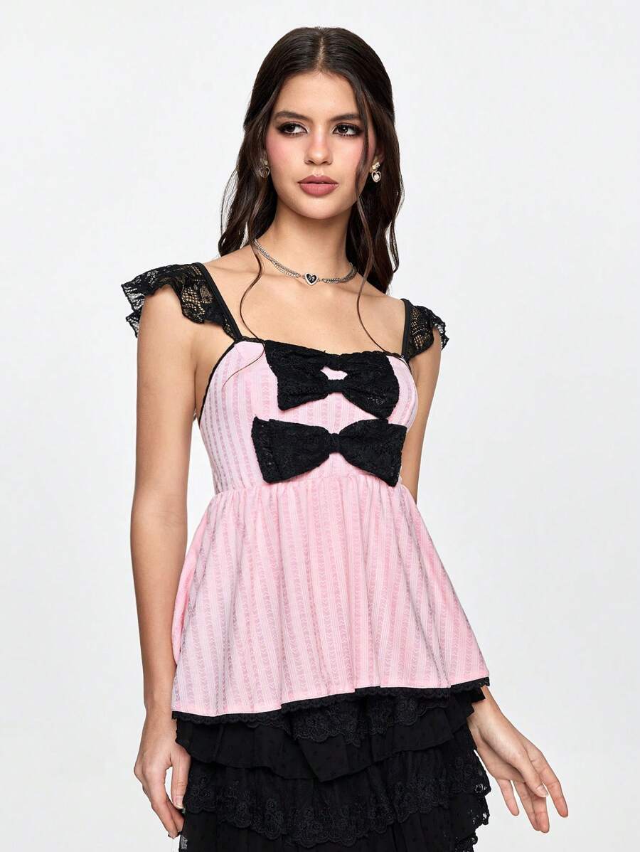Kawaii Women Vintage Romantic Valentine's Day Cute Doll Design Color Block Contrast Lace Babydoll Tank Top
