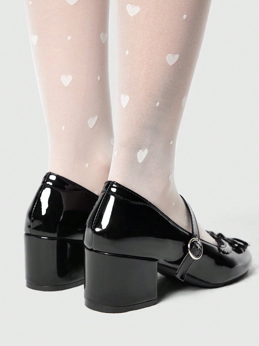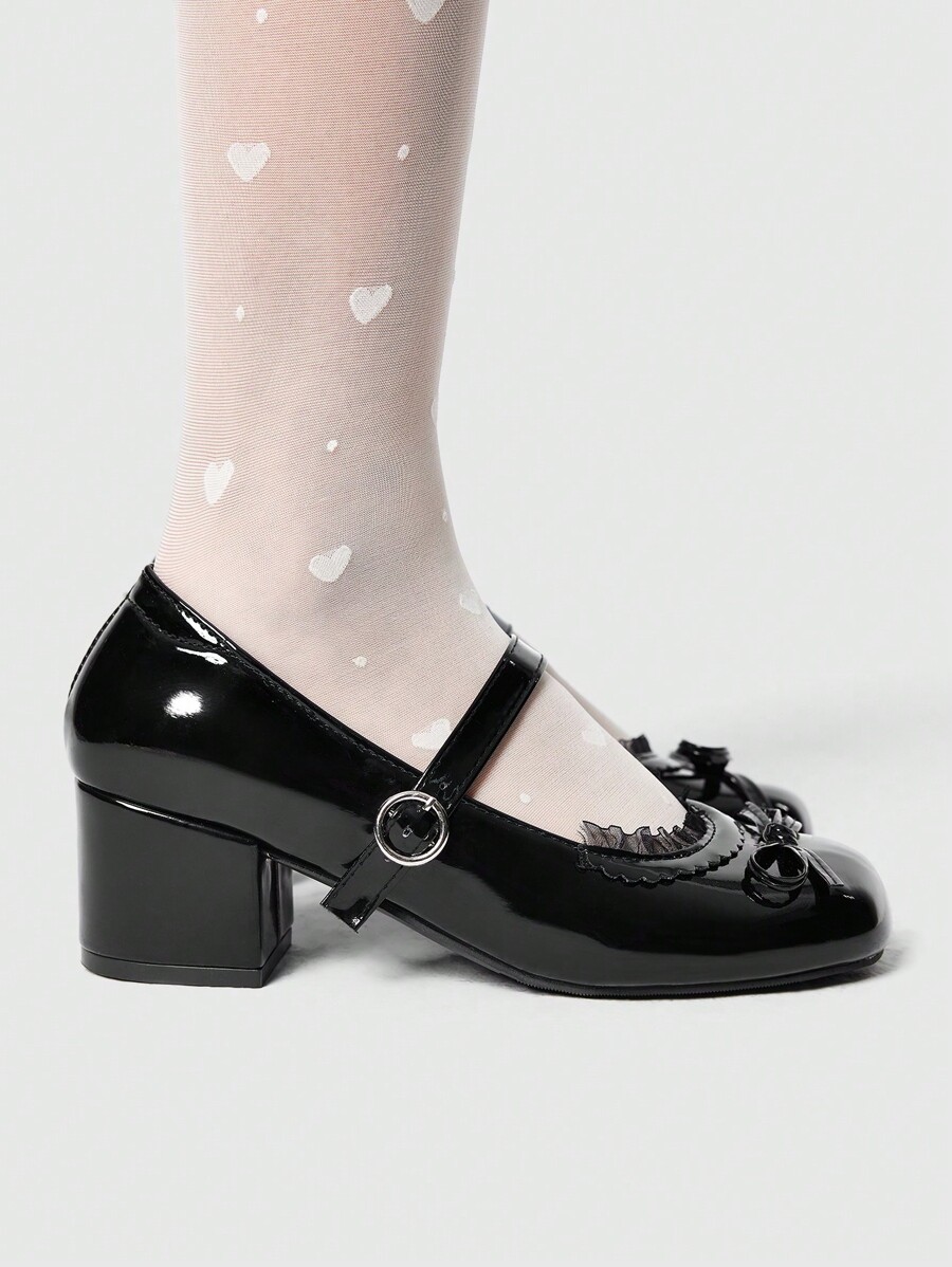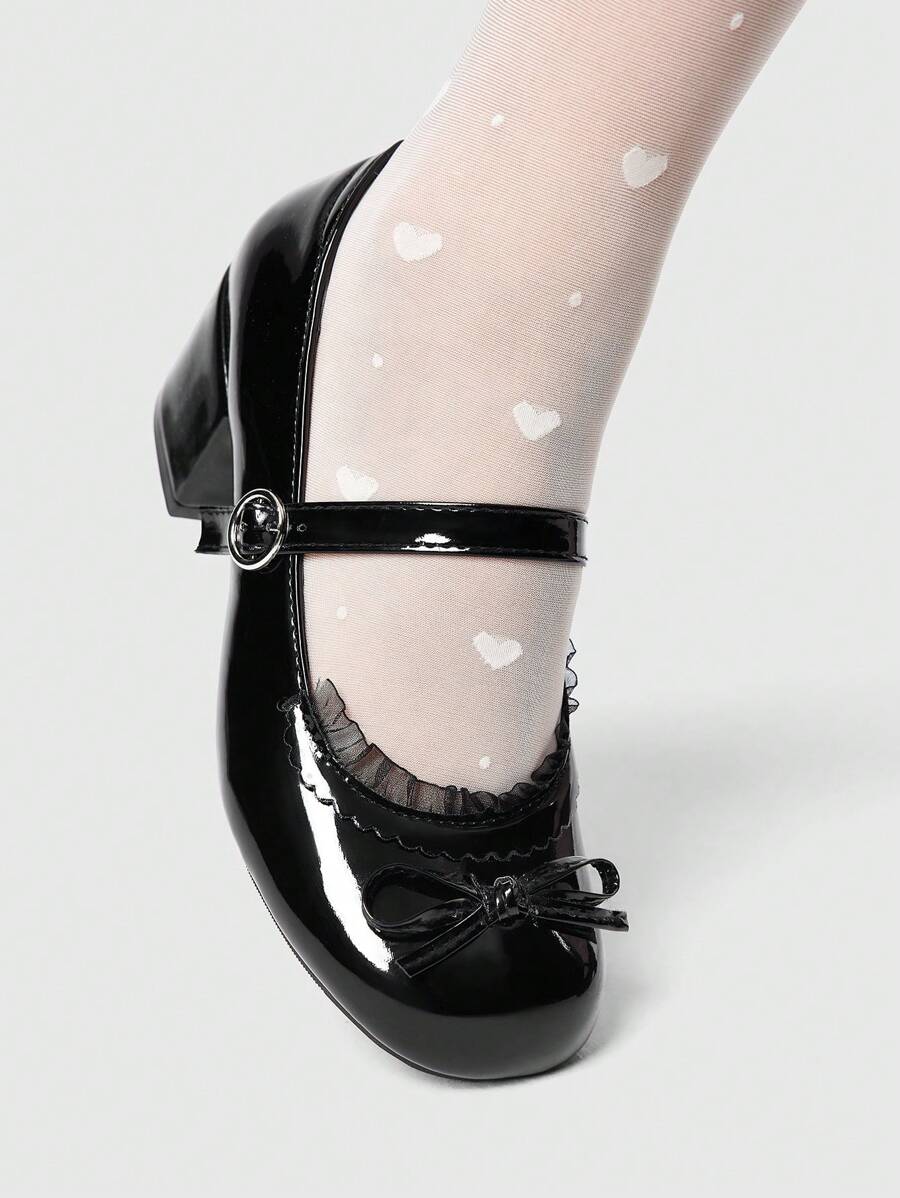 Kawaii Women's Black Mary Jane Low Heel Shoes, Cute Bow Decor, T-Strap Buckle Closure, Loafer Design, High Heeled For Christmas And New Year Holiday Vibe Fall And Winter