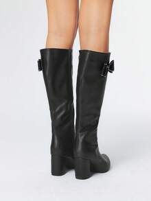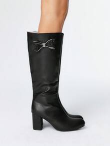 Kawaii Women's Black Pointed Toe Rhinestone Bow Mid-Calf Boots