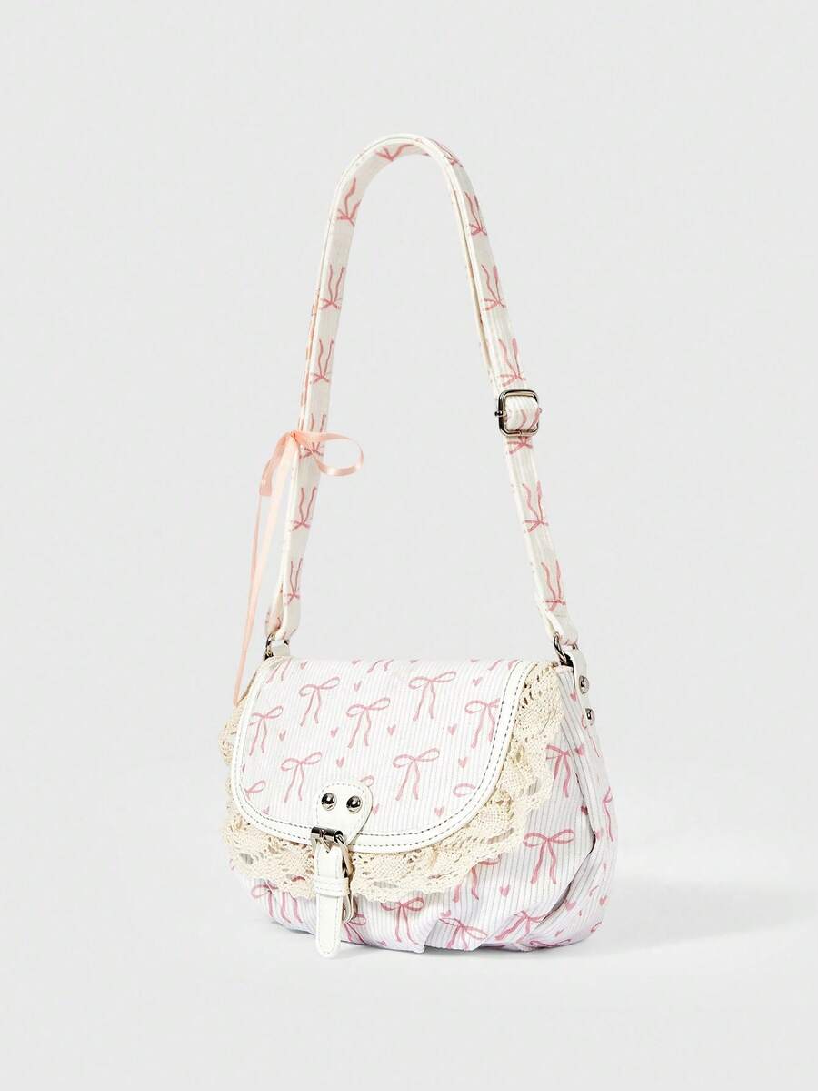 Kawaii Women's Bow Full Print Pattern Beige Corduroy Material Slanted Shoulder Bag, Suitable For Valentine's Day Dating
