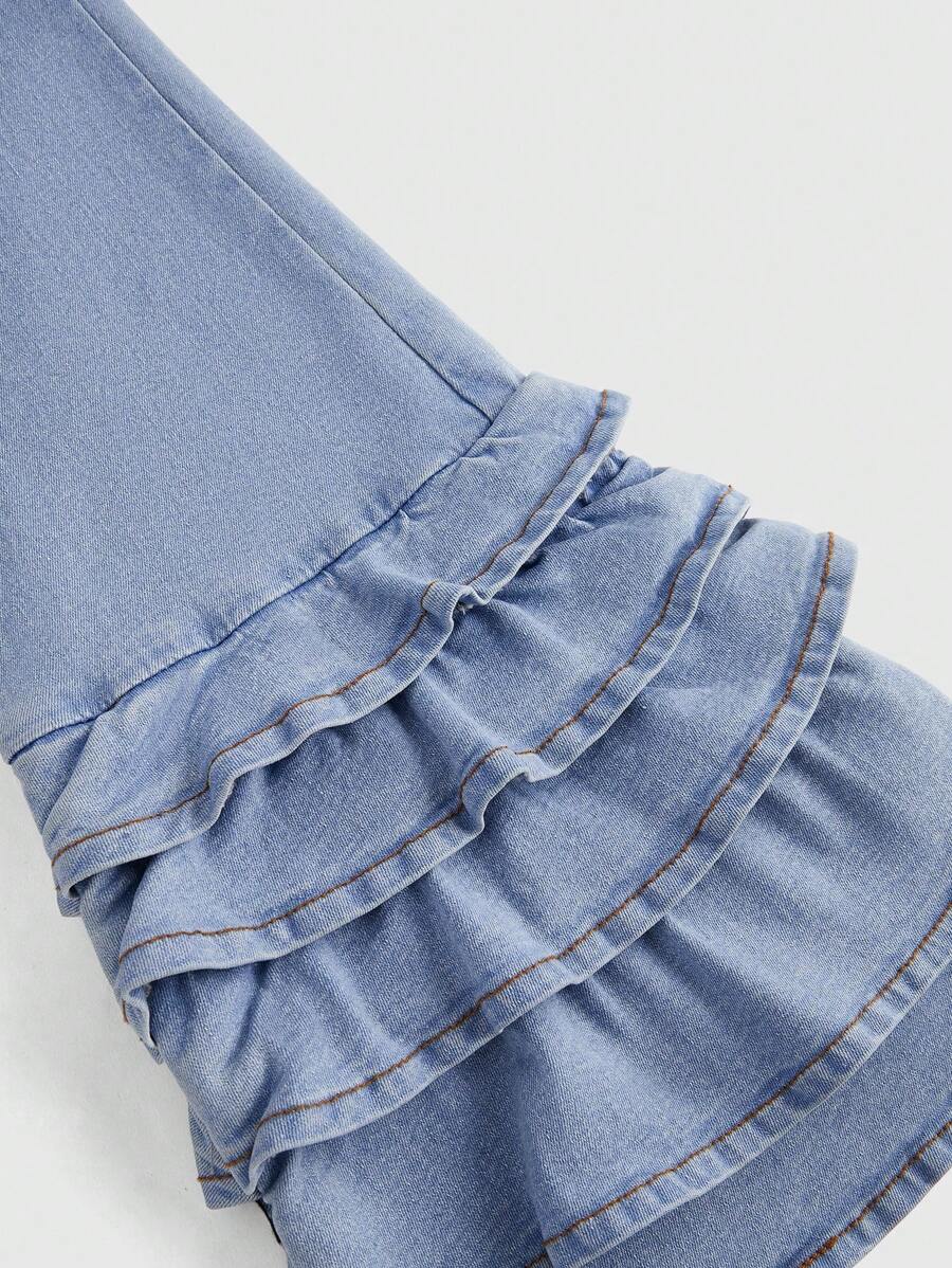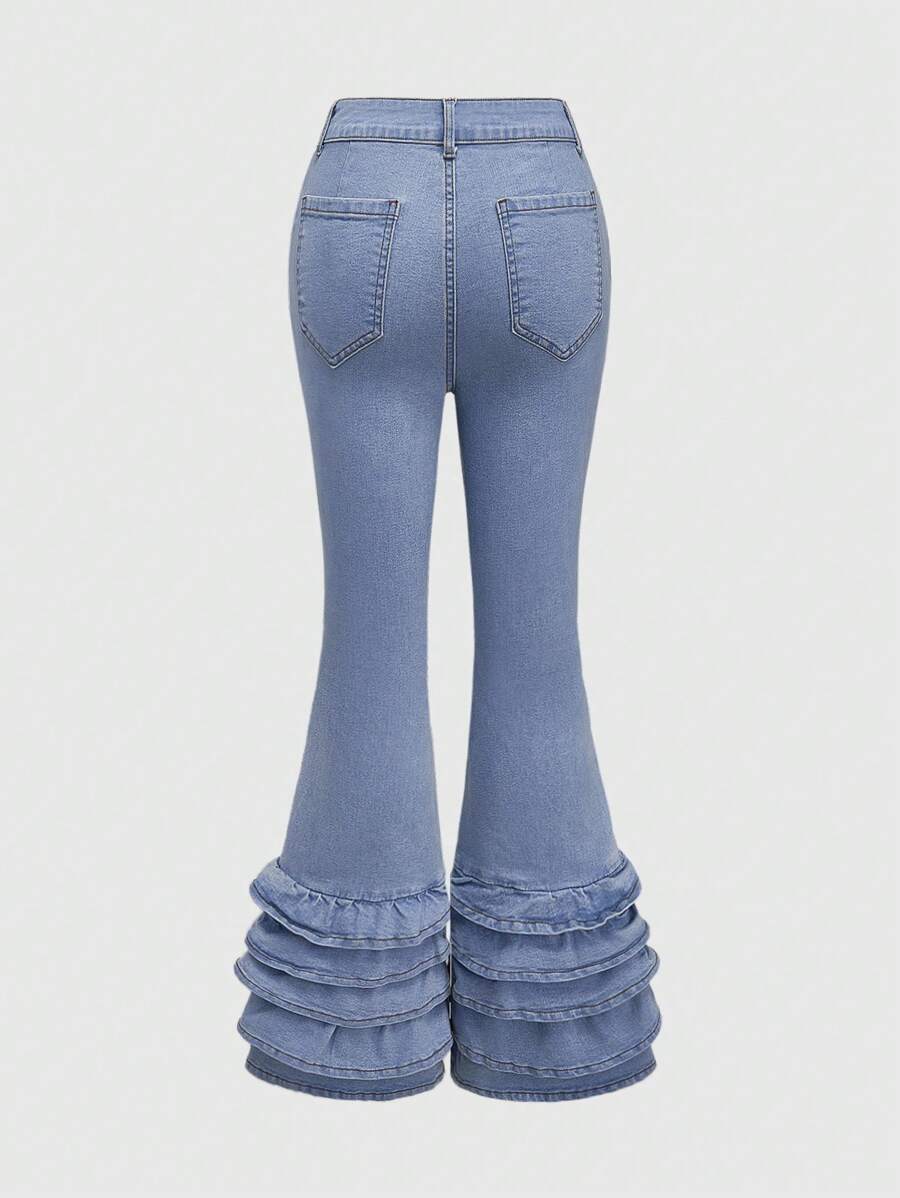 Kawaii Women's Casual Water-Washed Ruffled Hem Skinny Flare Jeans