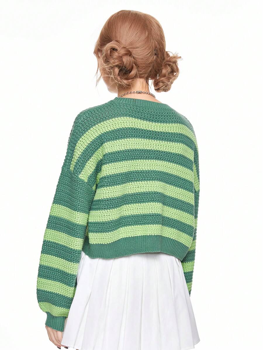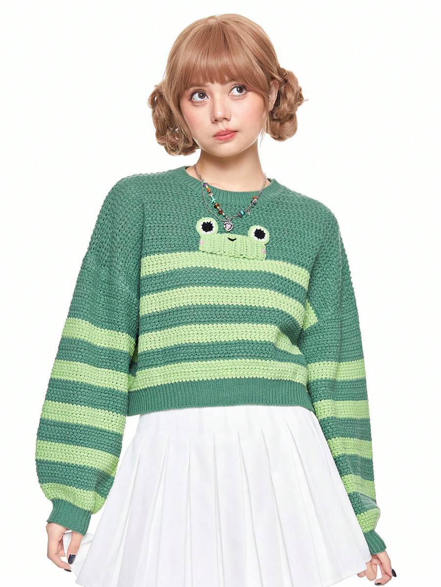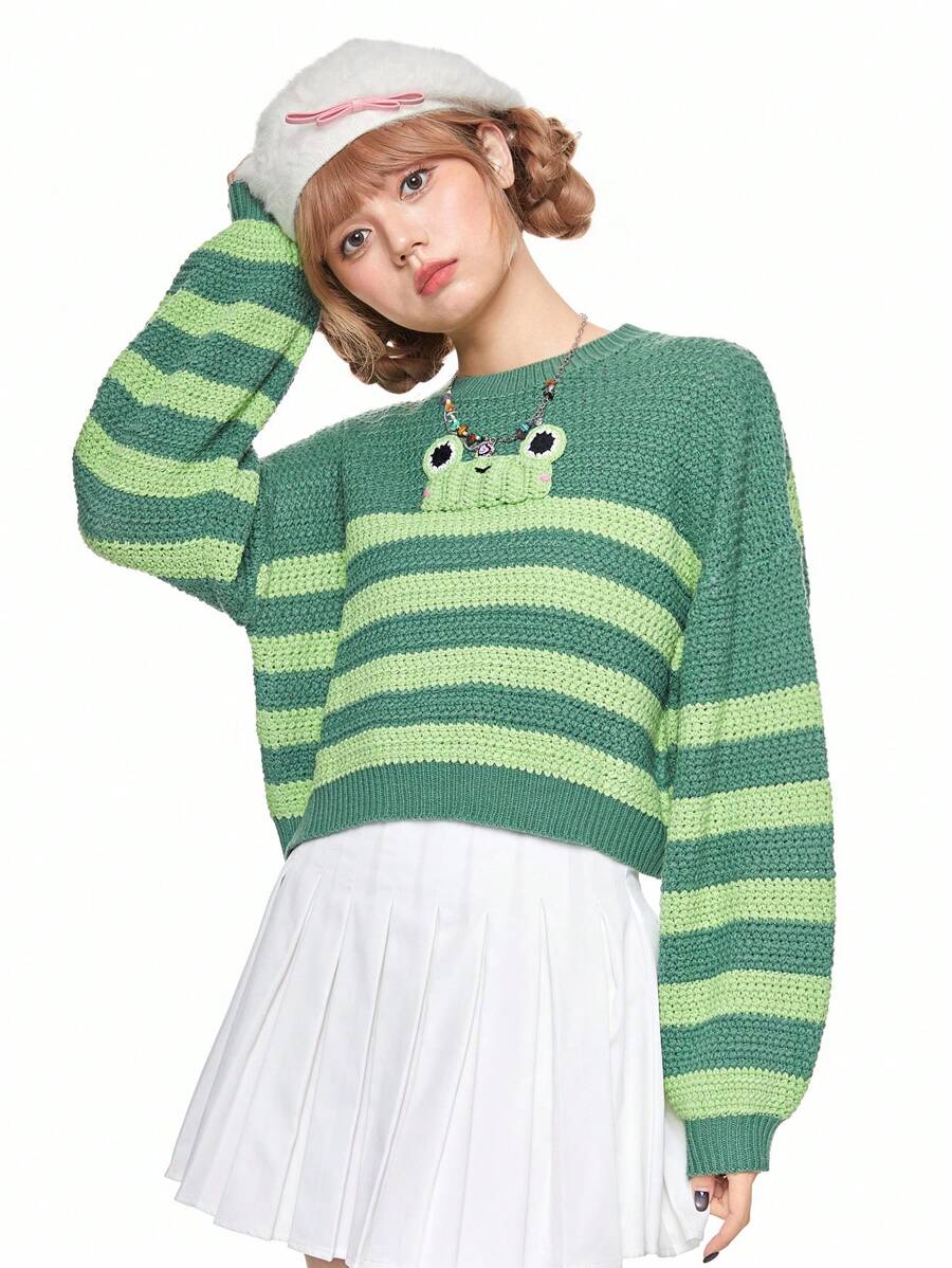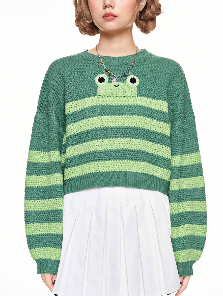Kawaii Women's Cute Frog Striped Round Neck Drop Shoulder Long Sleeve Sweater