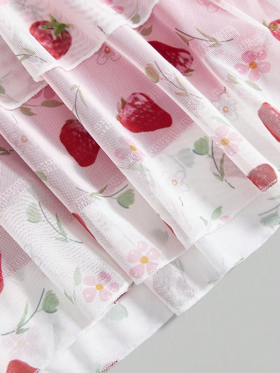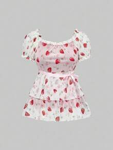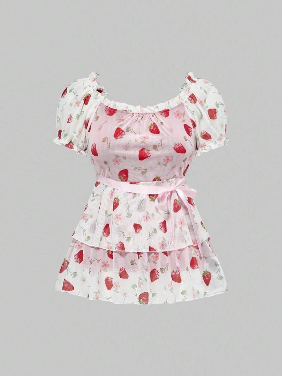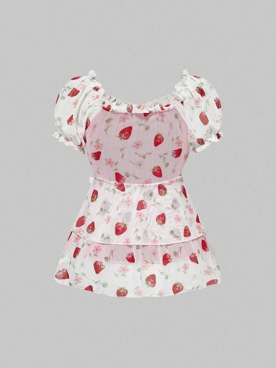 Kawaii Women's Cute Puff Sleeve Doll Style Strawberry Allover Print Top