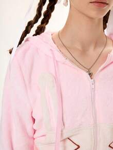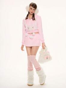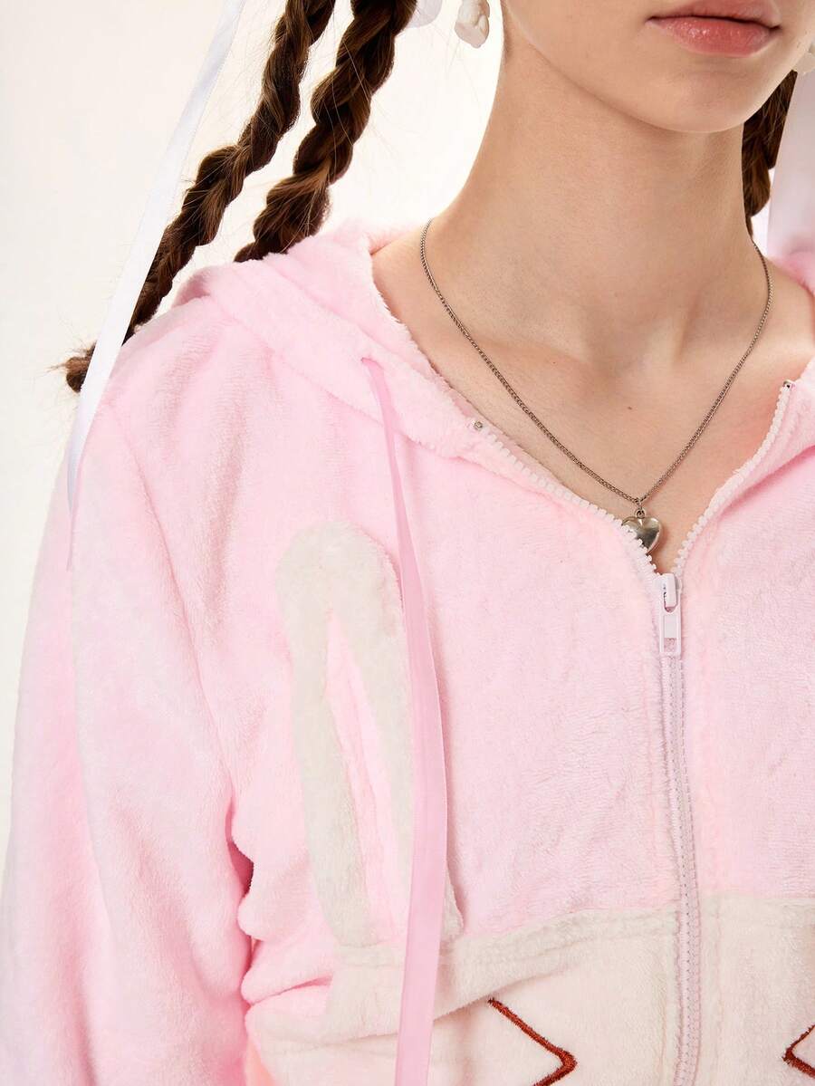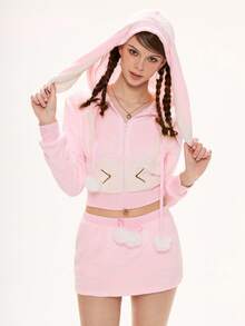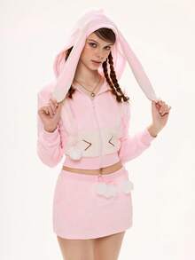 Kawaii Women's Cute Rabbit Ear Plush Patchwork Contrast Color Fabric Rabbit Tail 2 Pieces Set