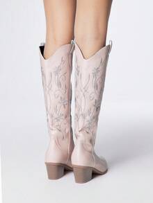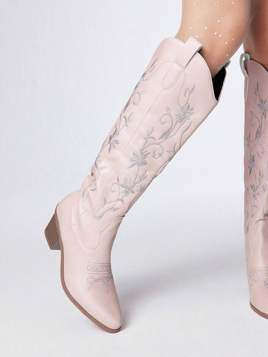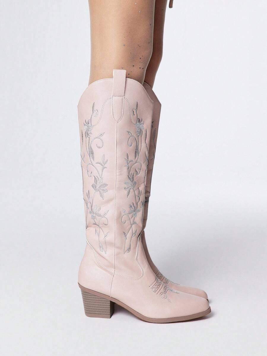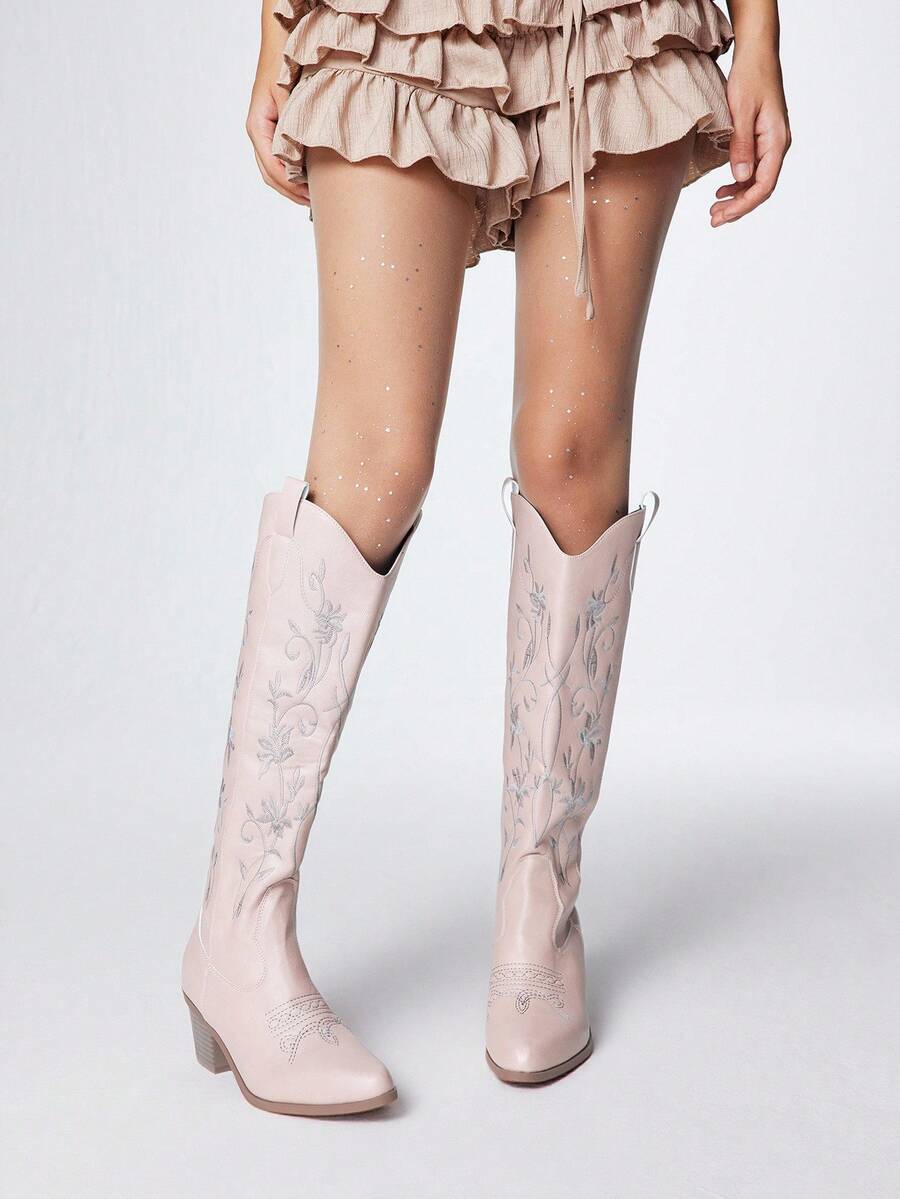 Kawaii Women's Hollow Design Butterfly Wing Embroidery Western Boots, New Spring/Autumn Leather Over-The-Knee Boots, Pink