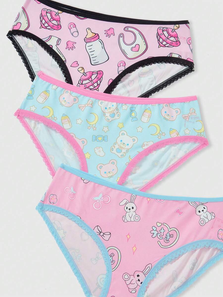 Women's Kawaii Flower Lace Cartoon Printed Triangle Underwear, 3pcs/Pack