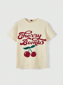 Kawaii Women's Letter & Cherry Printed Short Sleeve T-Shirt Cherry Bomb