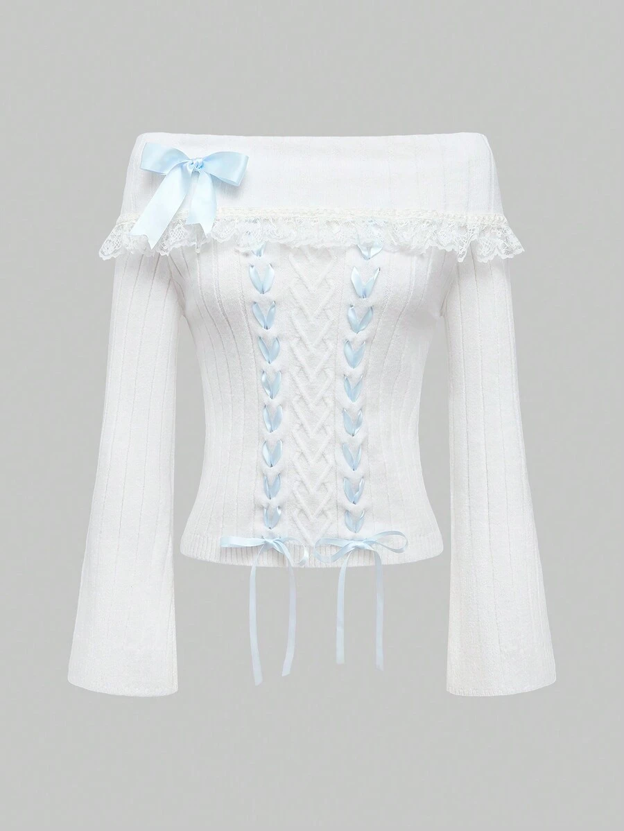 Kawaii Women's Off-Shoulder Long Sleeve Casual Sweater With Bow Decor