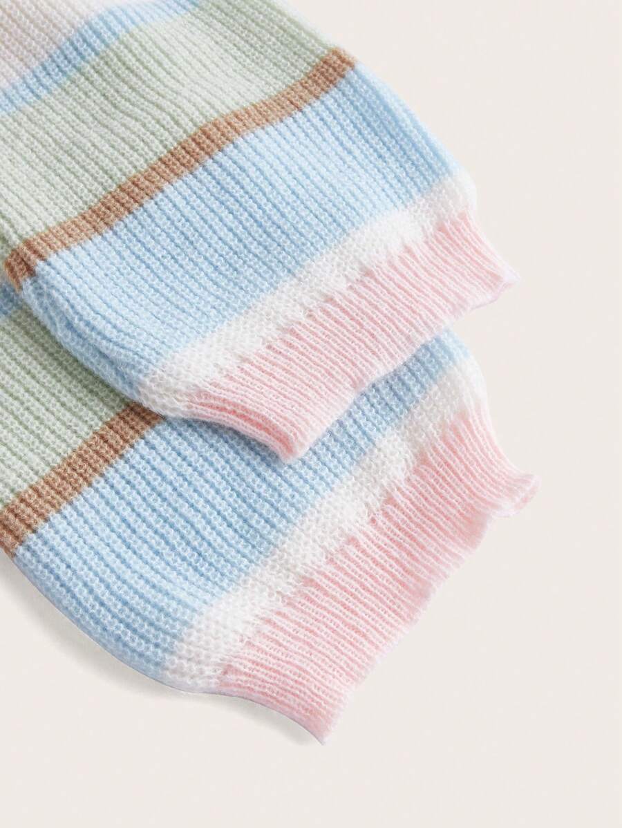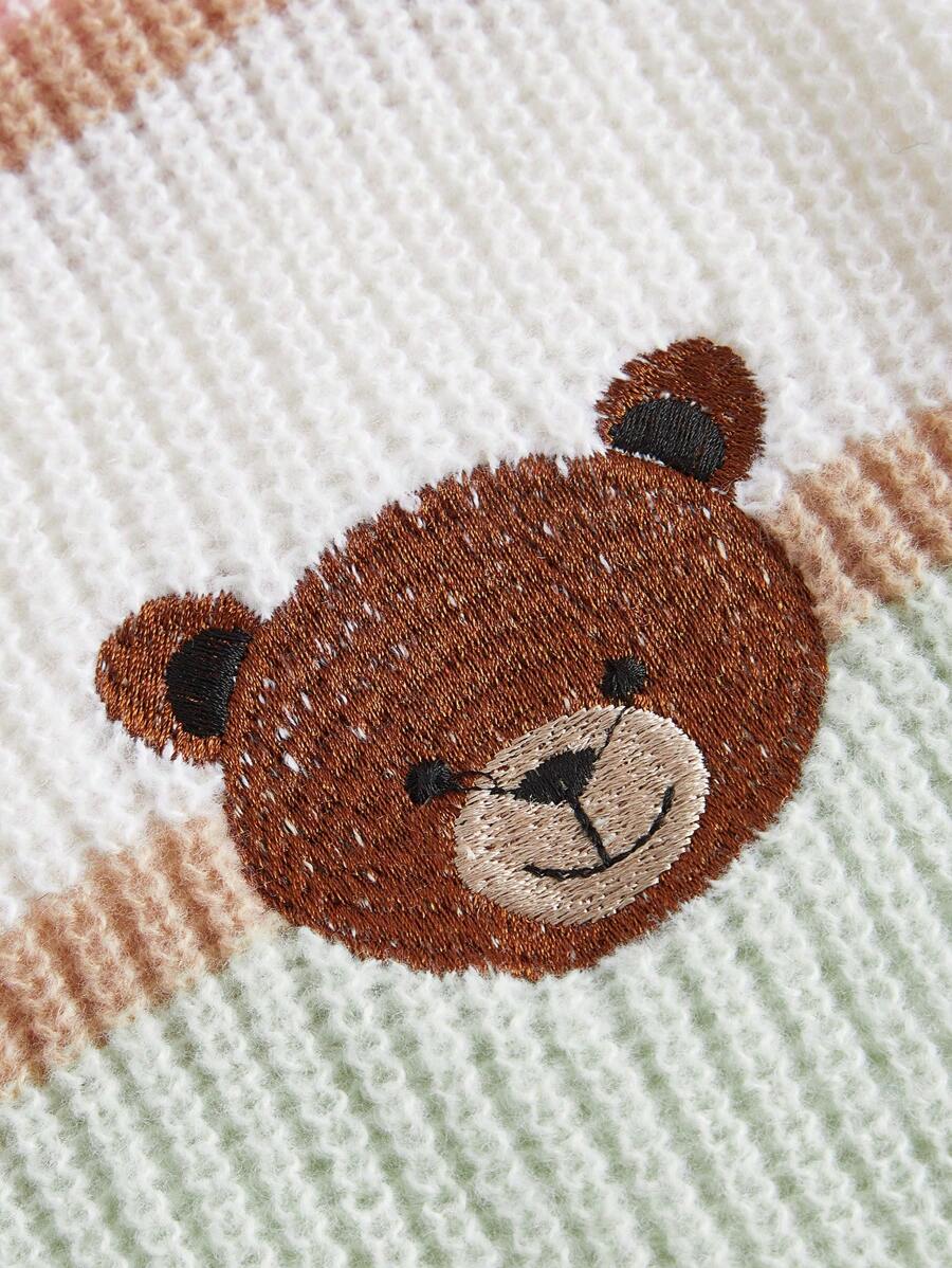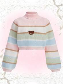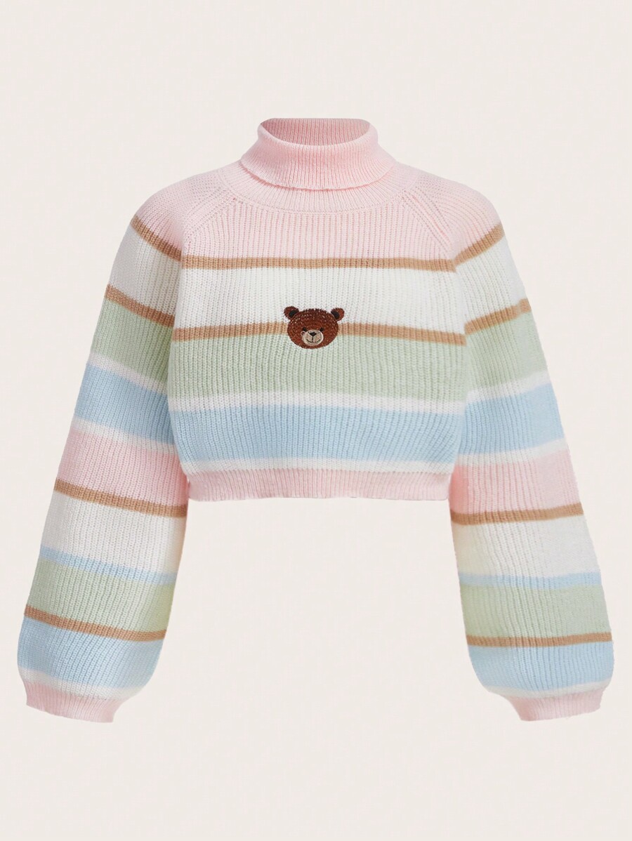 Kawaii Women's Plus Size High Neck Striped Sweater With Bear Embroidery