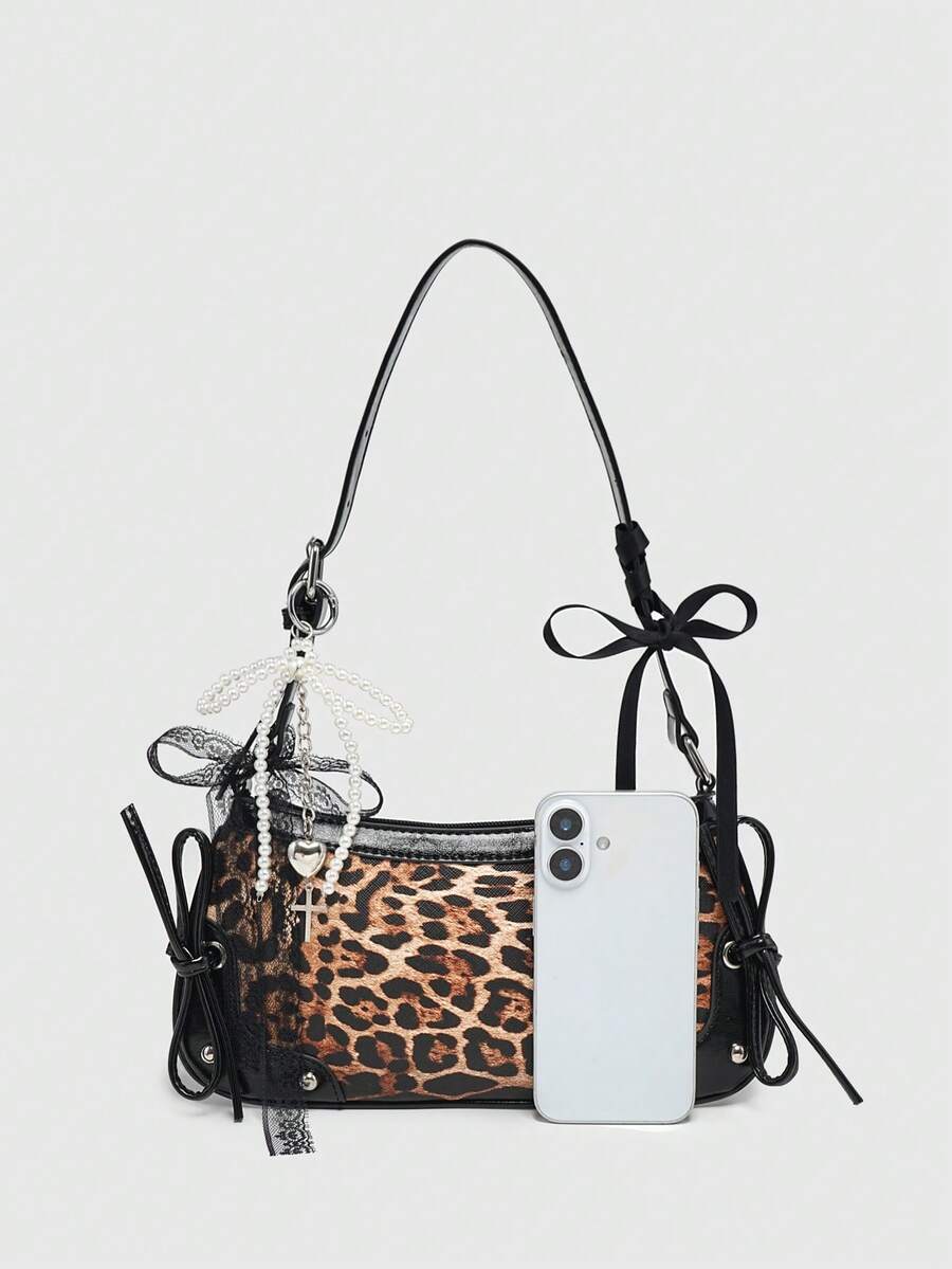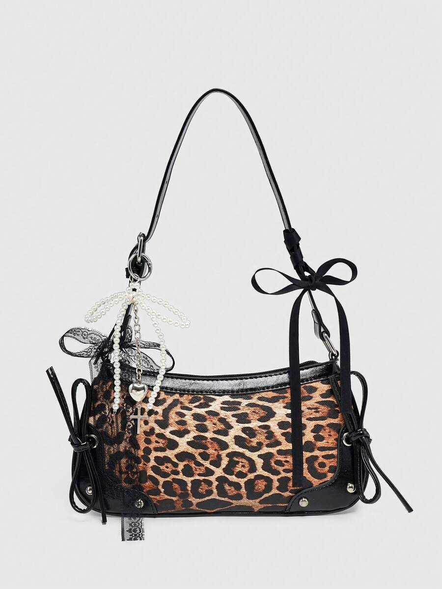 Kawaii Women's Retro Ballet Style Butterfly Decor Chain Leopard Print Faux Pearl Lace Decor Shoulder/Underarm Baguette Bag, Shoulder Bag, Animal Print Women Bag, Fall Winter Fashionable Cheetah Print Purse For Women, New Fall Winter Tiger Print Bag For Women