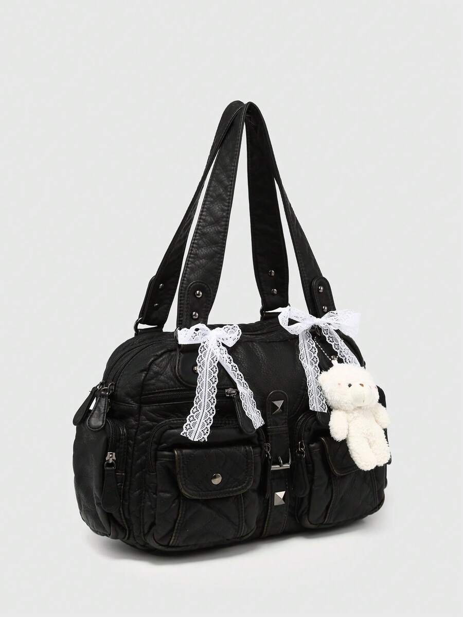 Kawaii Women's Retro Distressed Gradient Cross & Heart Pendant Decoration Bowknot Strap Tote Bag, Large Capacity Shoulder Bag With Multiple Pockets