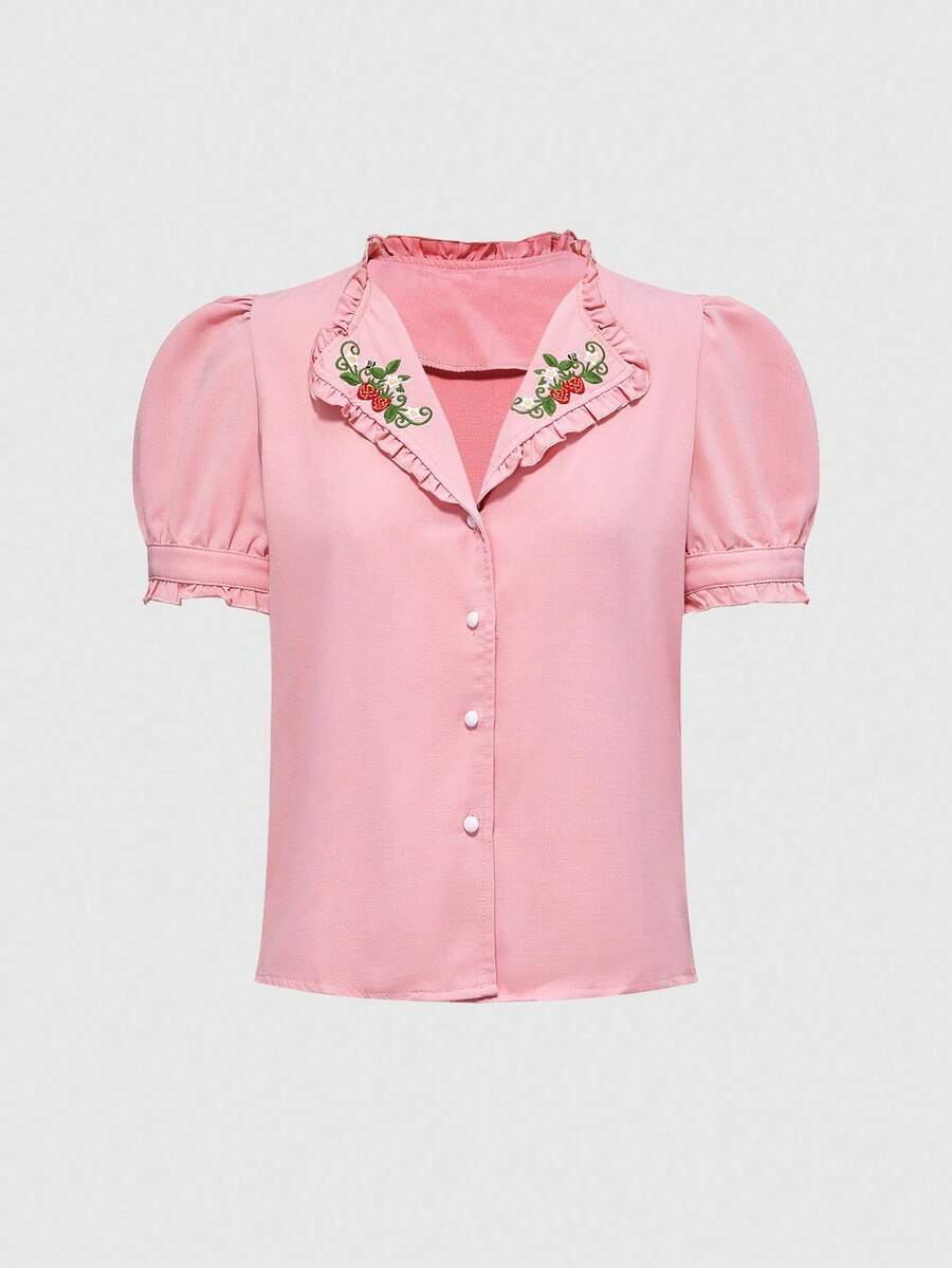 Kawaii Women's Simple Short Sleeve Shirt With Flower Embroidery Decoration, Daily Wear