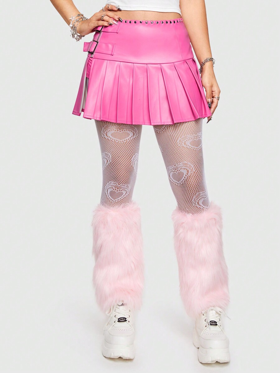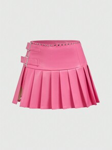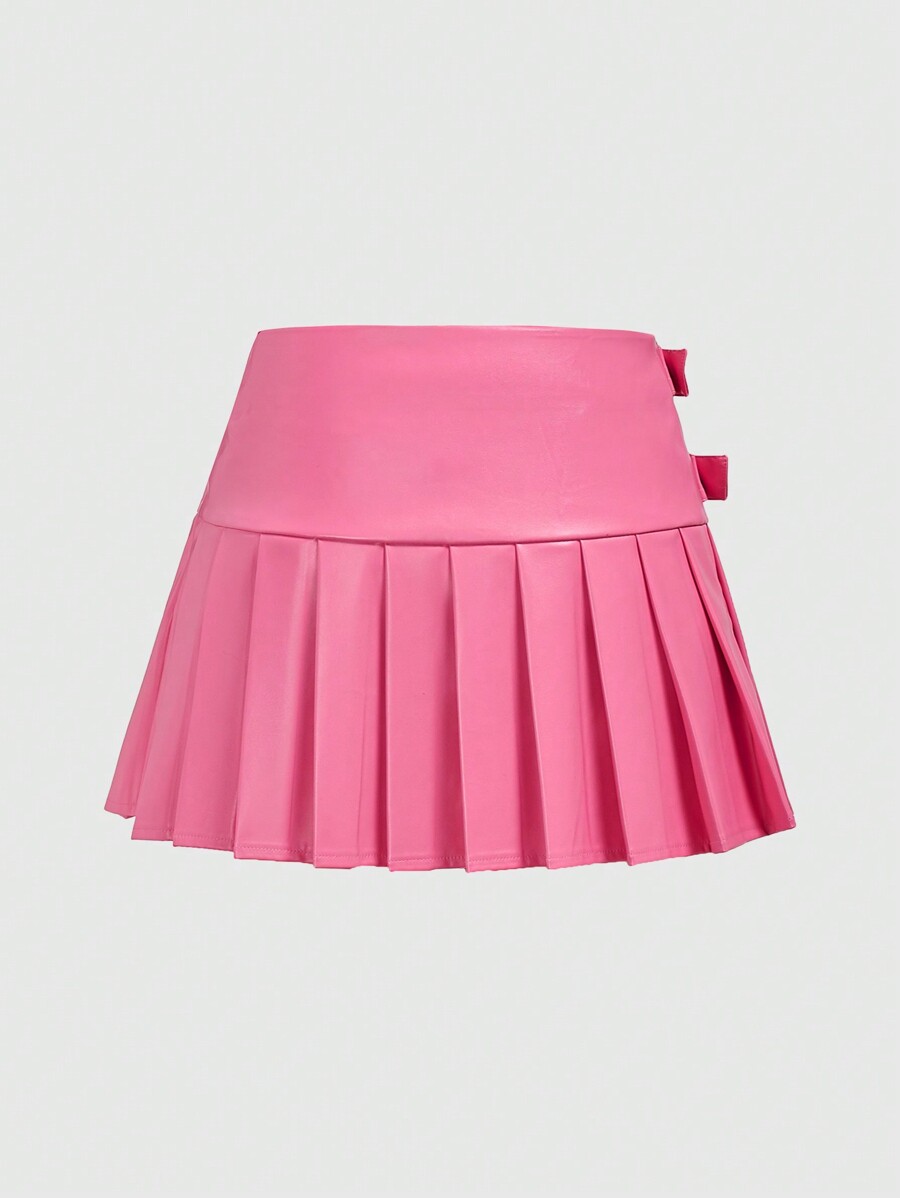 Kawaii Women's Solid Color Pleated Skirt With Decorative Buckle And Front Slit