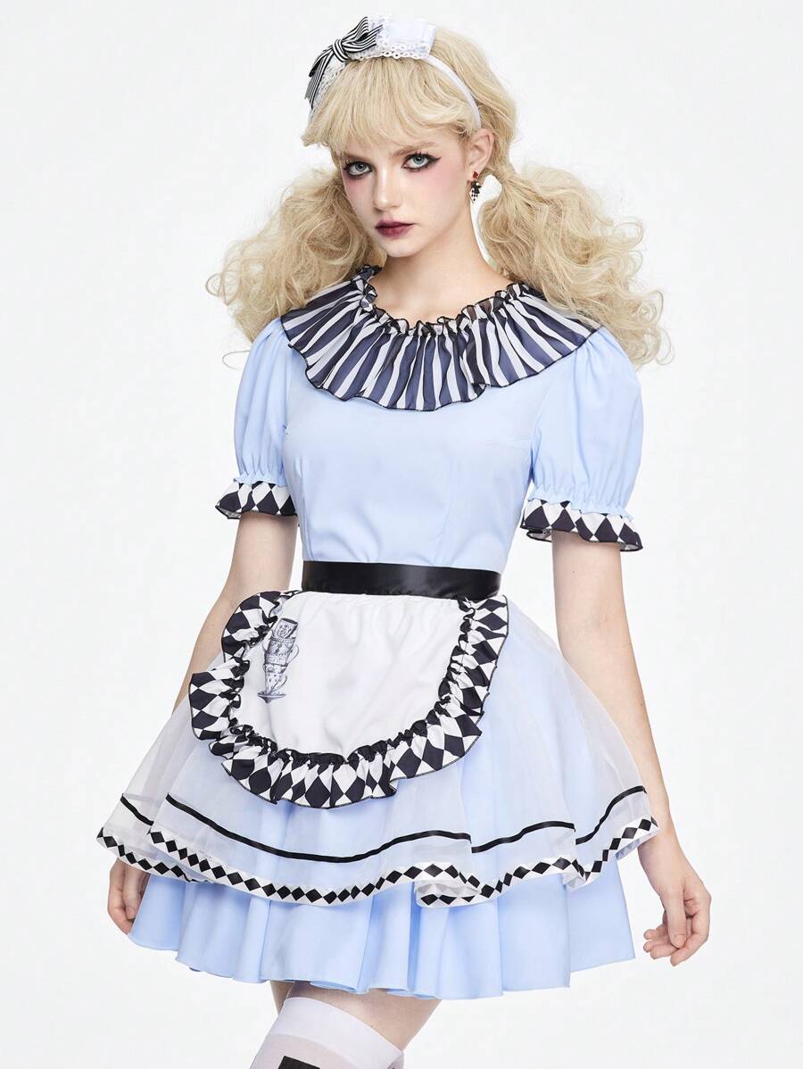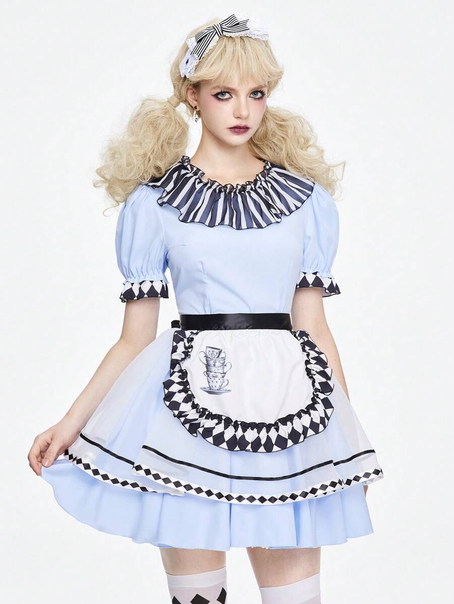 Kawaii Women's Striped Cosplay Dress And Apron Set With Contrasting Colors