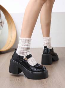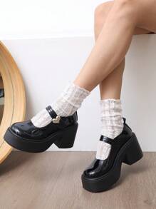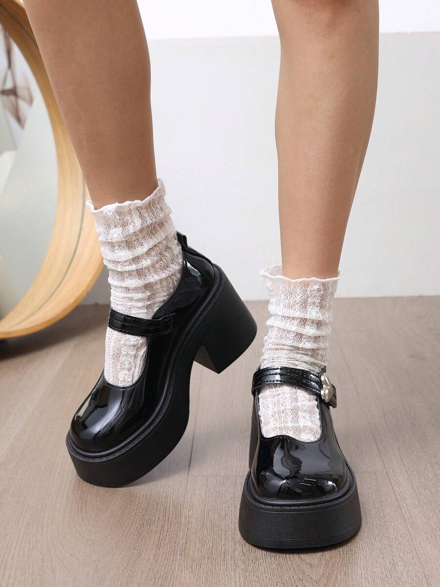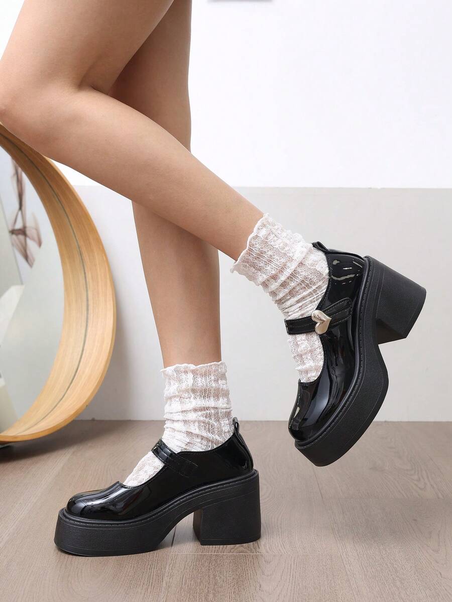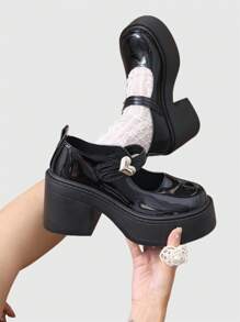 Kawaii Women's Thick-Soled Mary Jane Shoes, Spring & Autumn Patent Leather Hook-And-Loop Closure Heart Buckle French Vintage Chunky High Heels