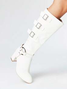 Kawaii Women's White Buckle Pointed Toe Low Heel Mid-Calf Boots