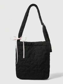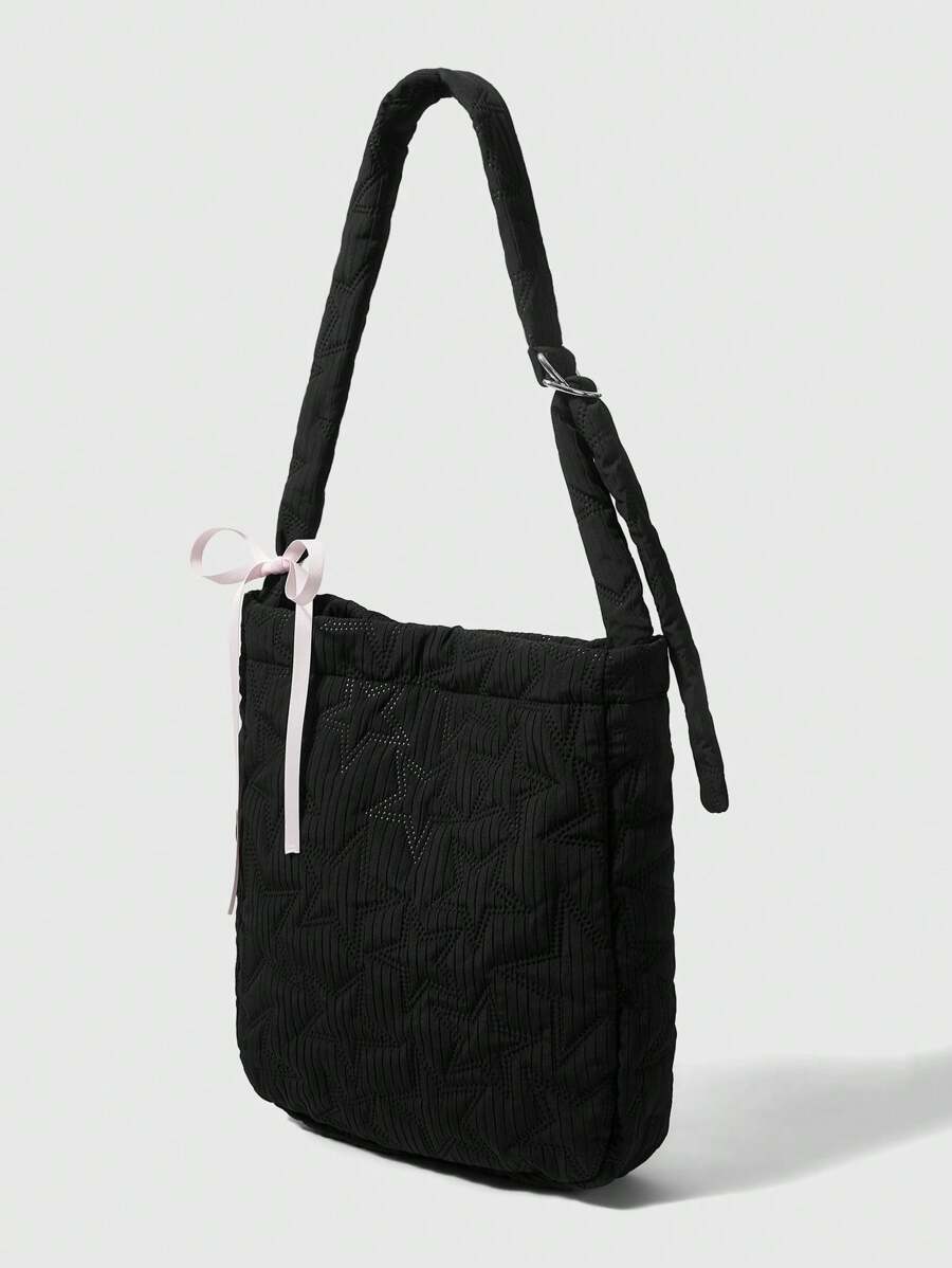 Kawaii Women's Y2K Minimalist Solid Color Star Embossed And Ribbon Bow Detail Handbag/Shoulder Tote Bag, Suitable For School, Shopping, Laptop