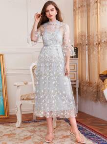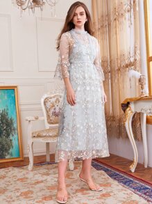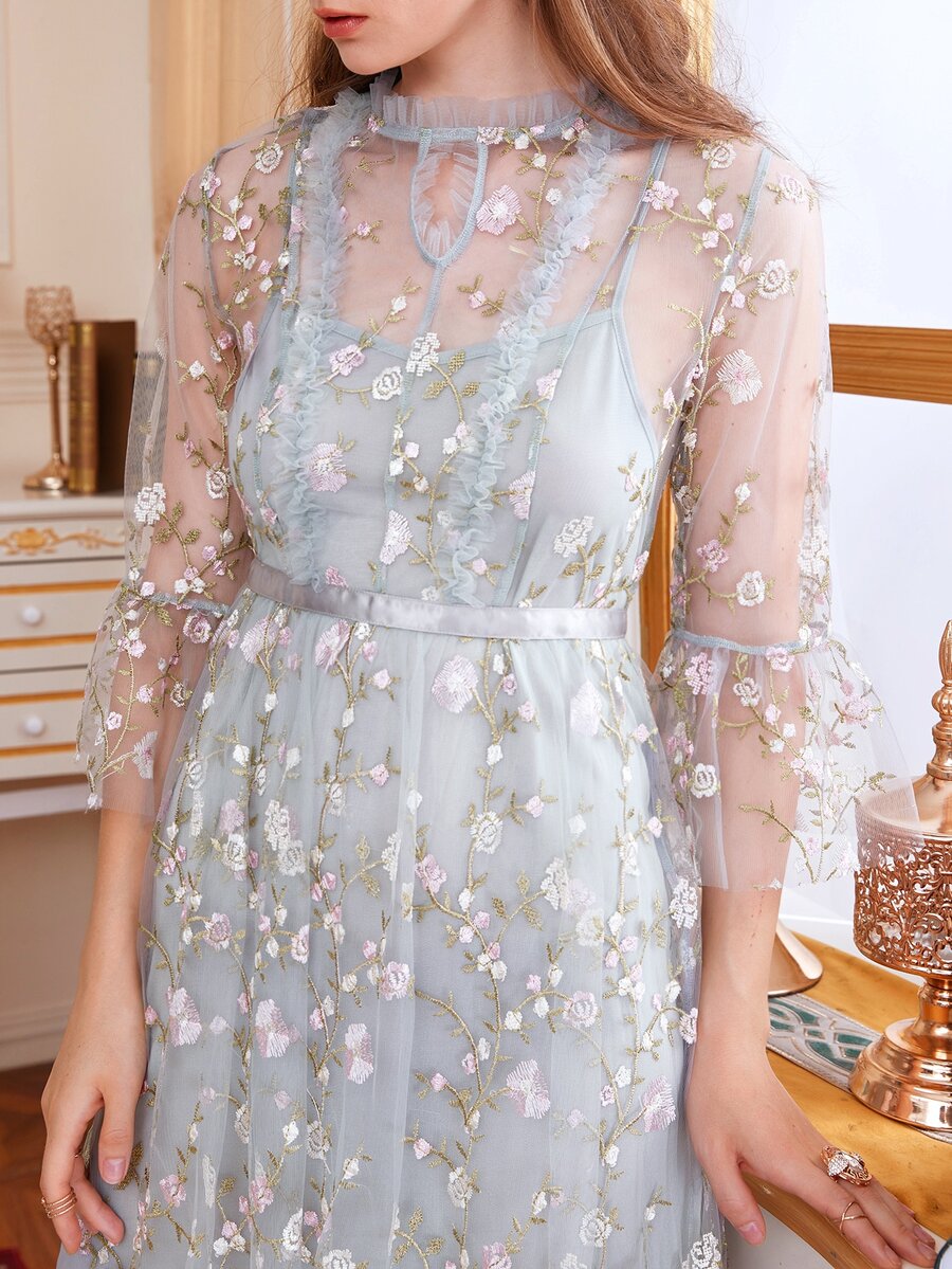 Keyhole Neck Flounce Sleeve Frill Trim Embroidery Mesh Dress