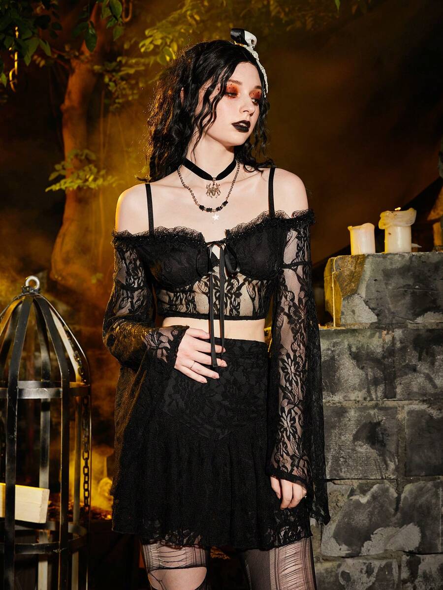 Knot Front Cold Shoulder Lace Blouse