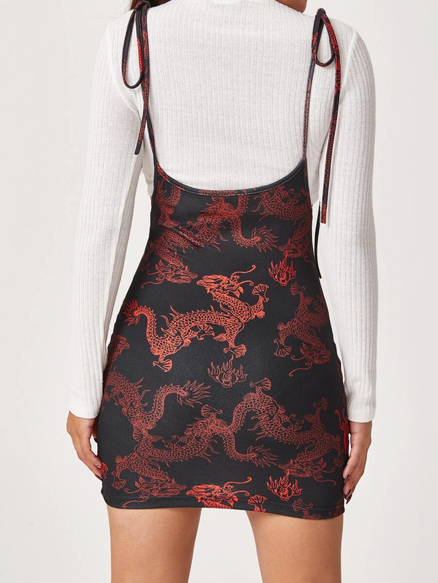 Knot Strap Split Hem Chinese Dragon Print Dress