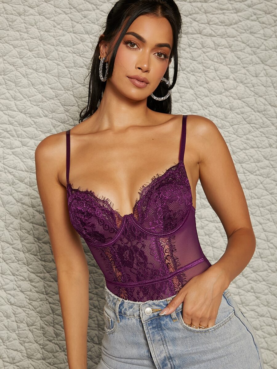 Lace See-Through Mesh Panel Push Up Bra Bodysuit
