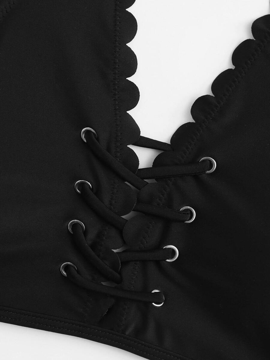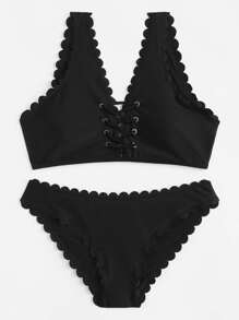 Lace Up Front Scallop Trim Bikini Set