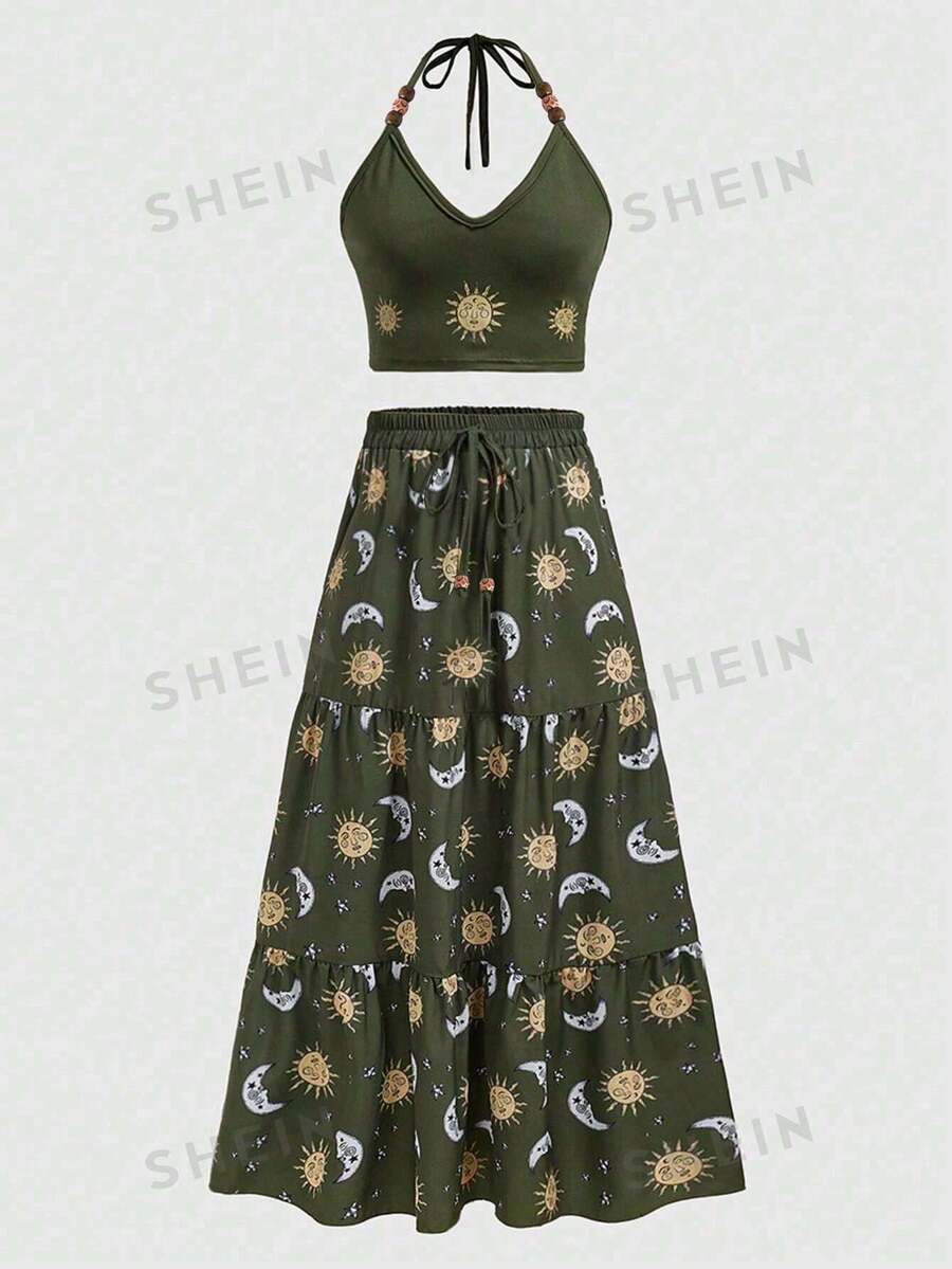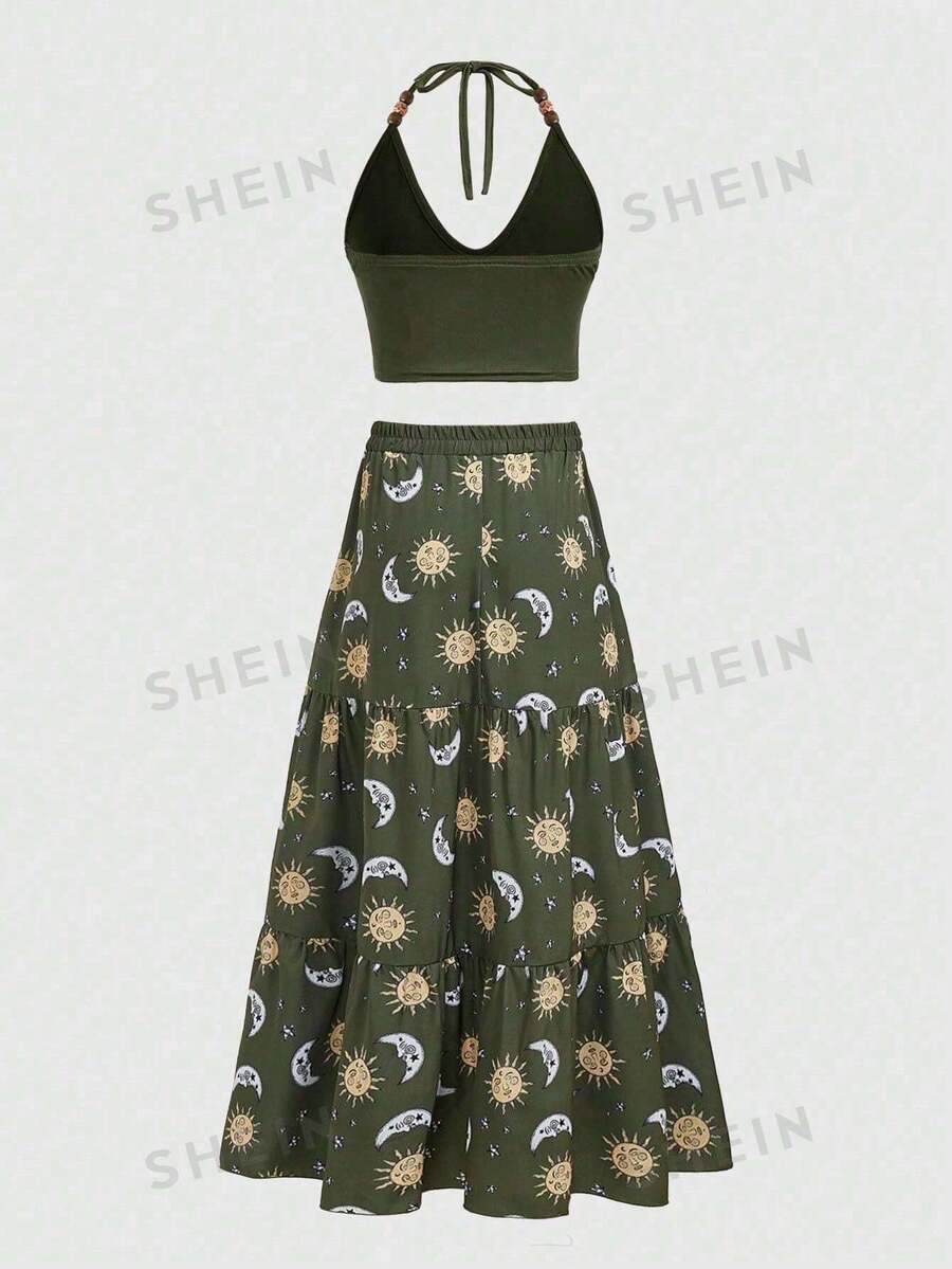 Hippie Ladies' Sun Pattern Halter Top And Skirt Set