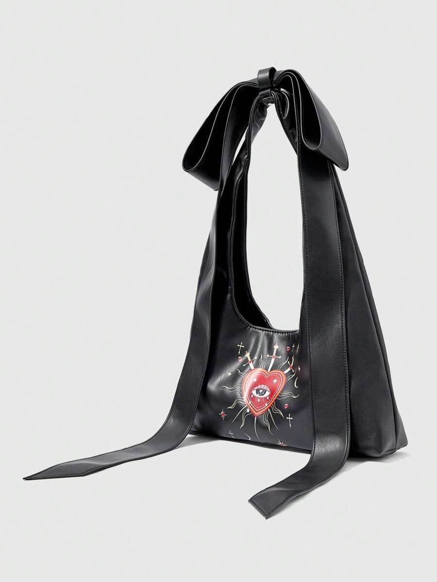 Ladies, Women Shoulder Bag, Hobo Bag, Punk, Pattern Print, Gothic Style, Bowknot Decoration, Fashionable, Personalized, Simple, Versatile, Street, Sweet And Cool Girls, Hot Girls, Y2k, Teenagers, Halloween, Halloween Bags Perfect For Fancy Party Matching With Halloween Costumes