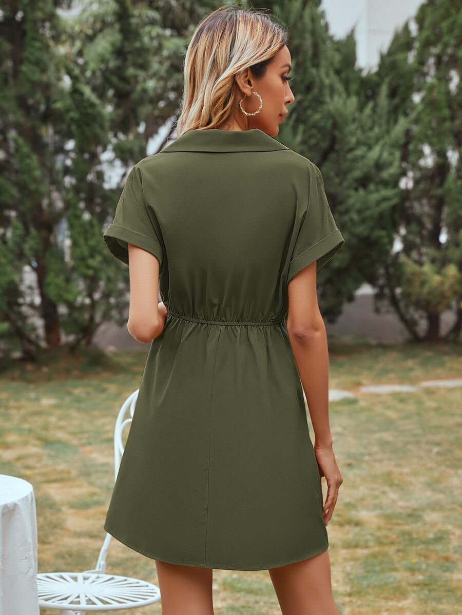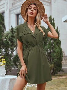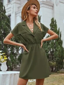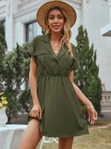 Lapel Collar Single Button Flap Pocket Shirt Dress