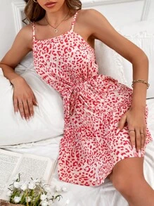 Leopard Print Frill Trim Belted Chiffon Cami Dress