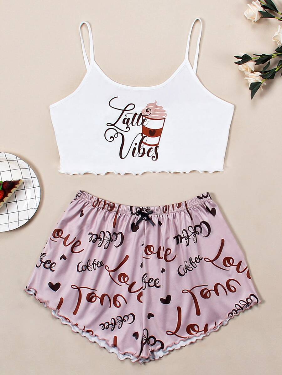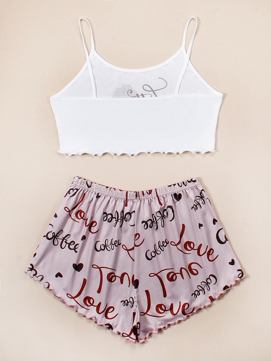 Letter And Heart Print Lettuce Trim Cami Pajama Set