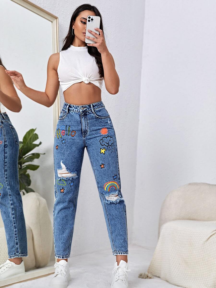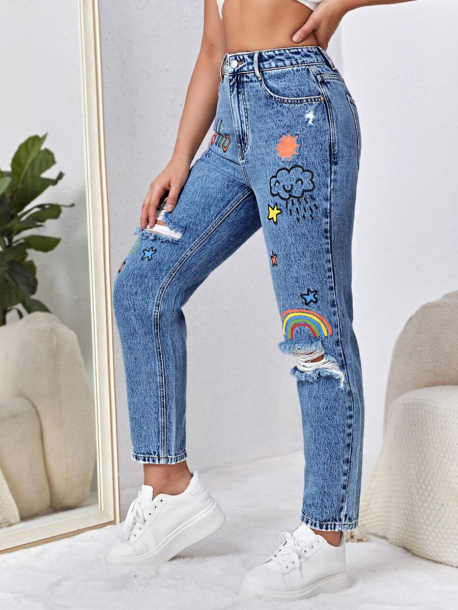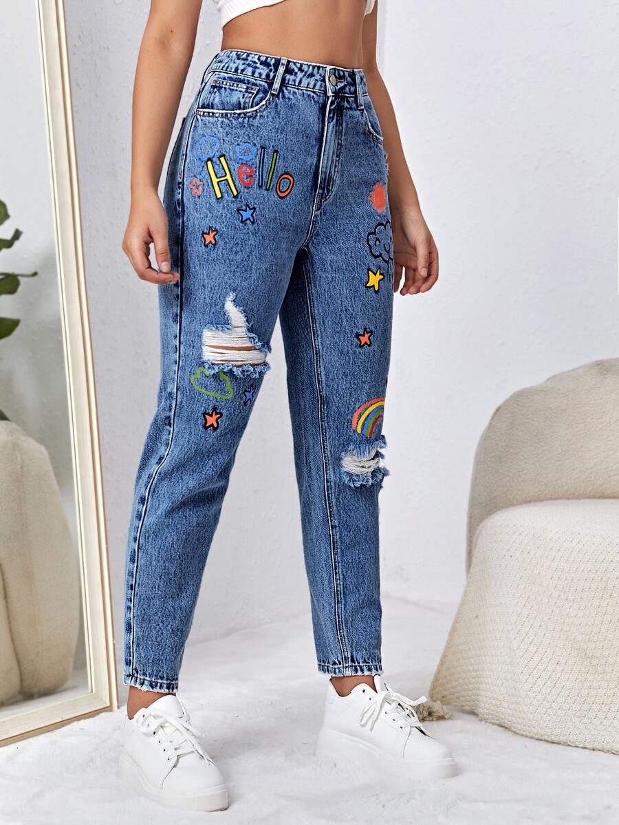 Letter & Cartoon Graphic Ripped Mom Fit Jeans